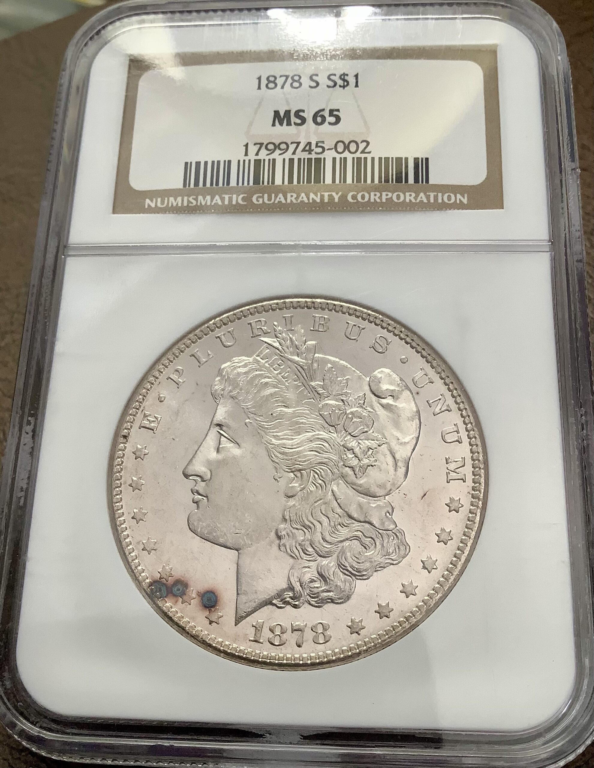 1878-S Morgan Silver Dollar – NGC MS65 in an older non-edge view holder.