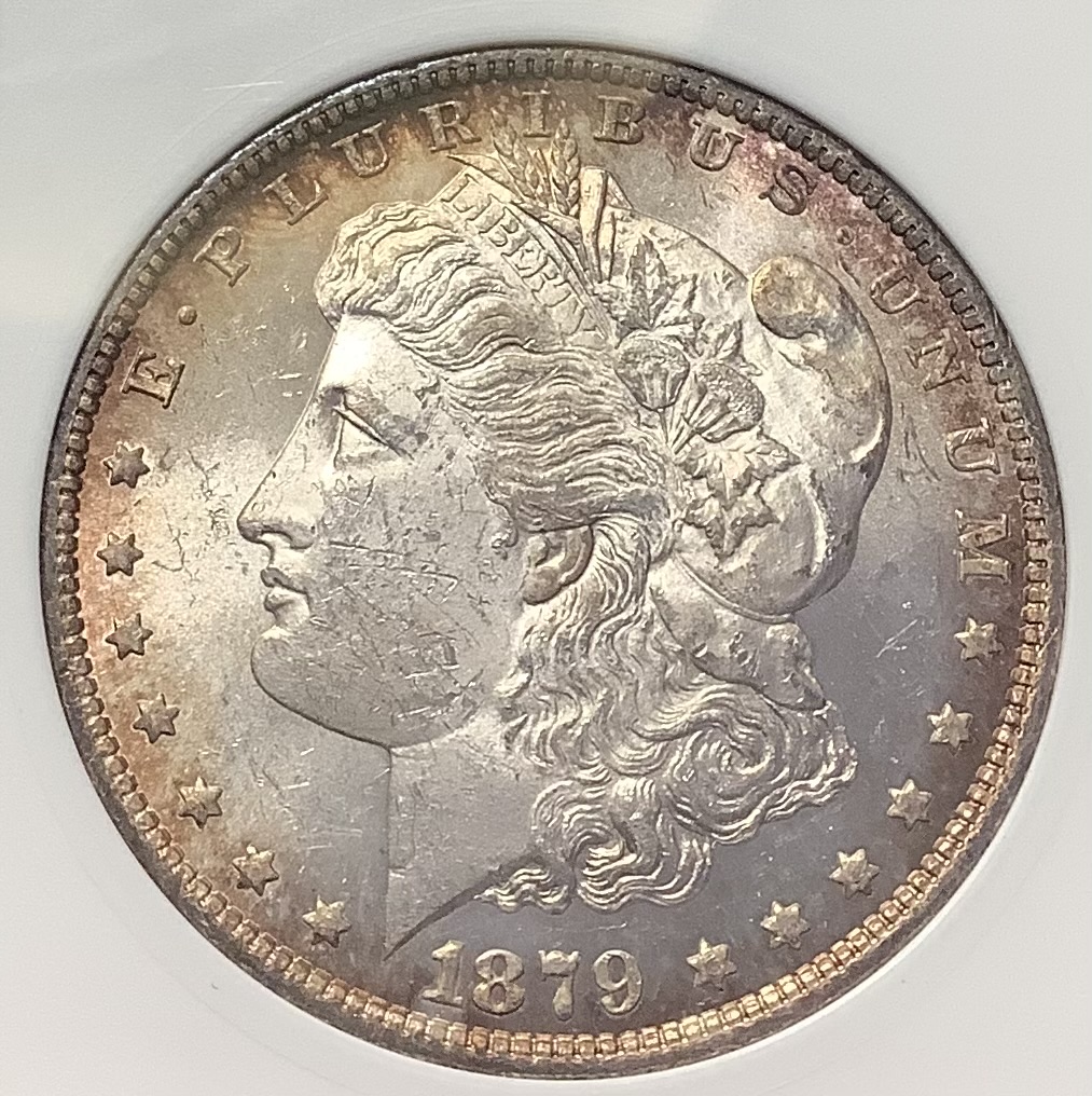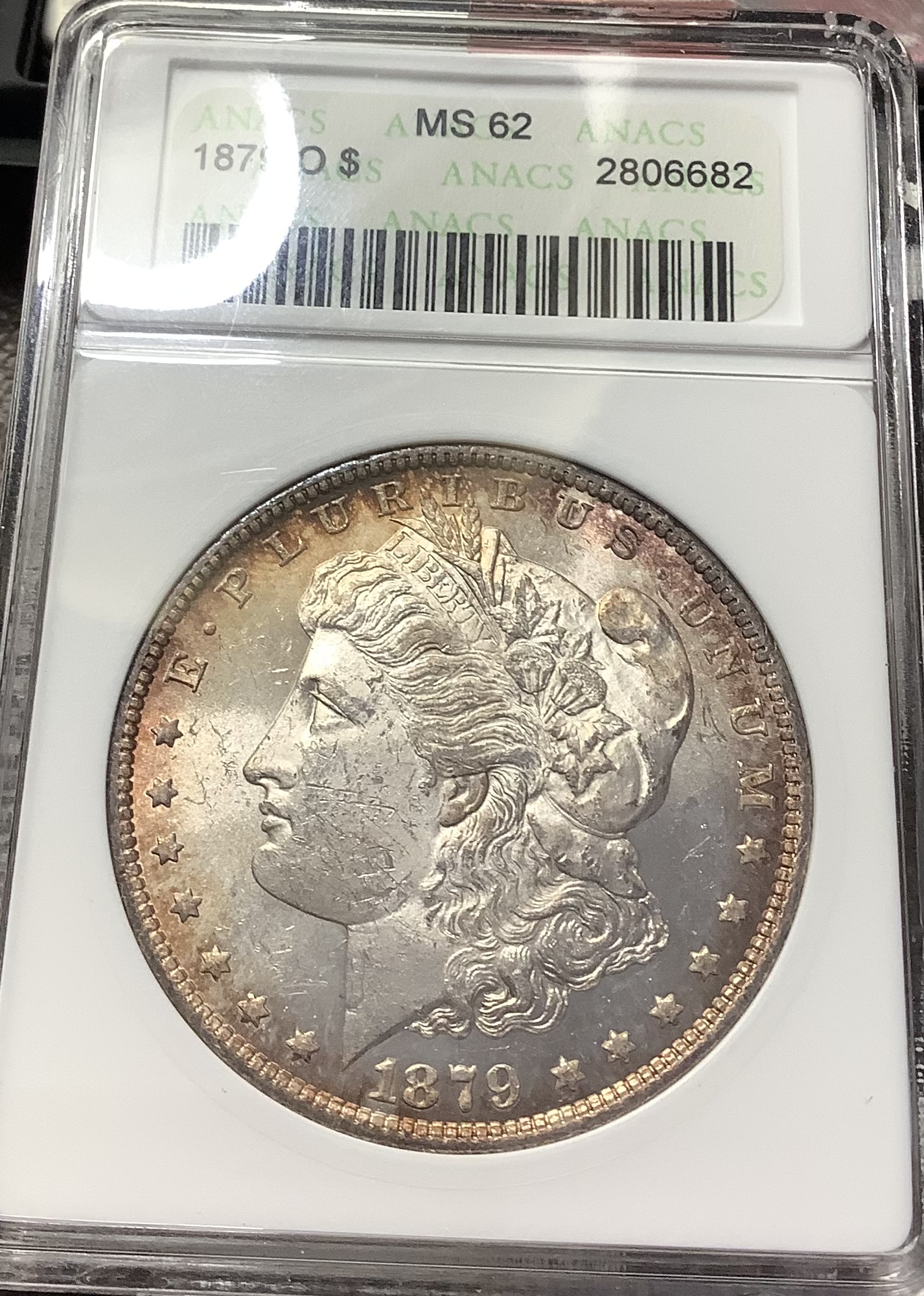1879-O Morgan Silver Dollar ANACS MS62 GREAT Toning, Luster Small White Soapbox