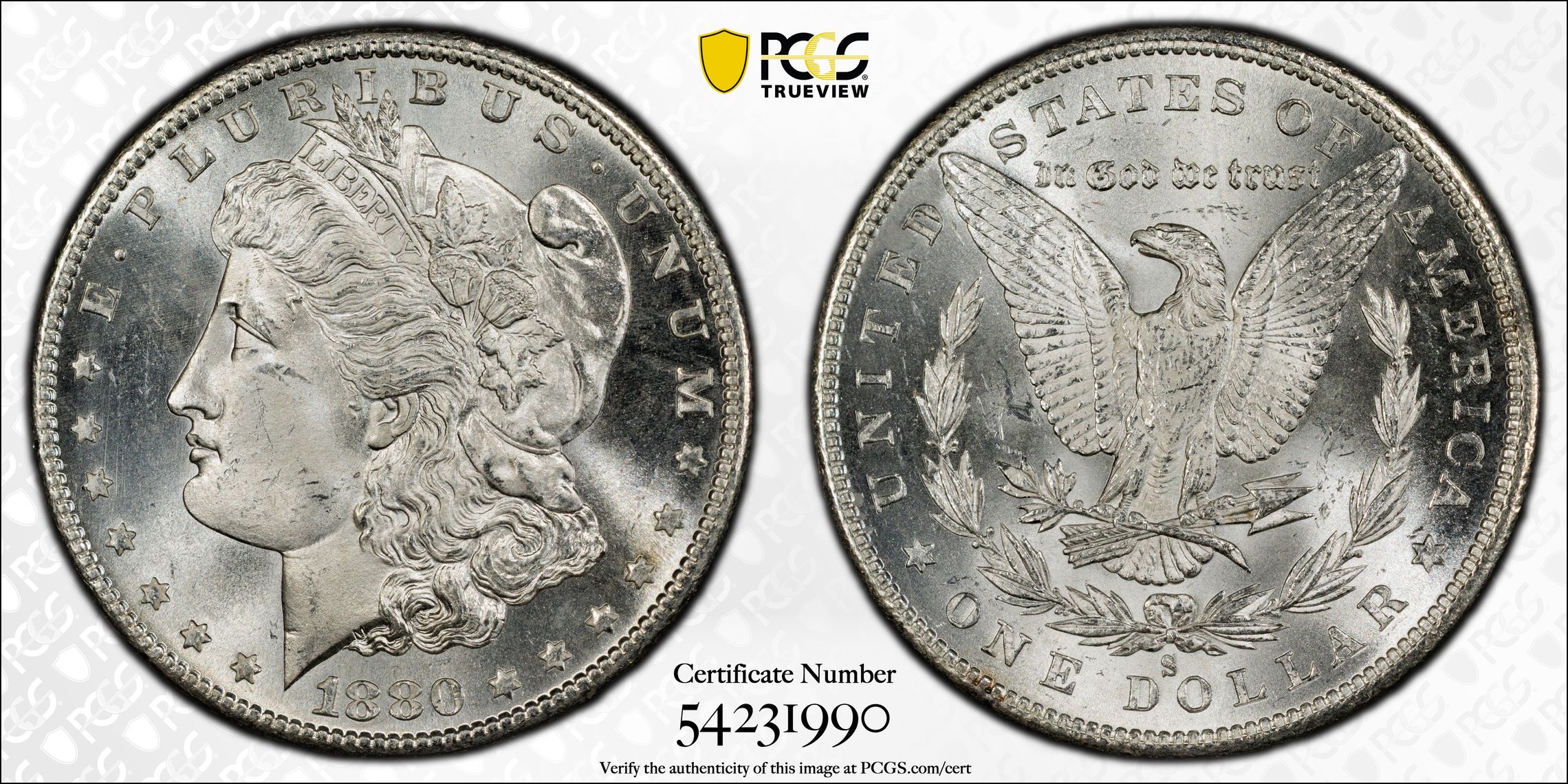 1880-S Morgan Silver Dollar just back from PCGS where it was graded PCGS MS65. One of the 3 1880-S submitted on this submission alone, all 3 graded MS65 (one 65+). The 2 consecutive cert numbers before this one are where the other 2, both vividly toned gems are located, PCGS Cert # 54231988, and PCGS #54231989).