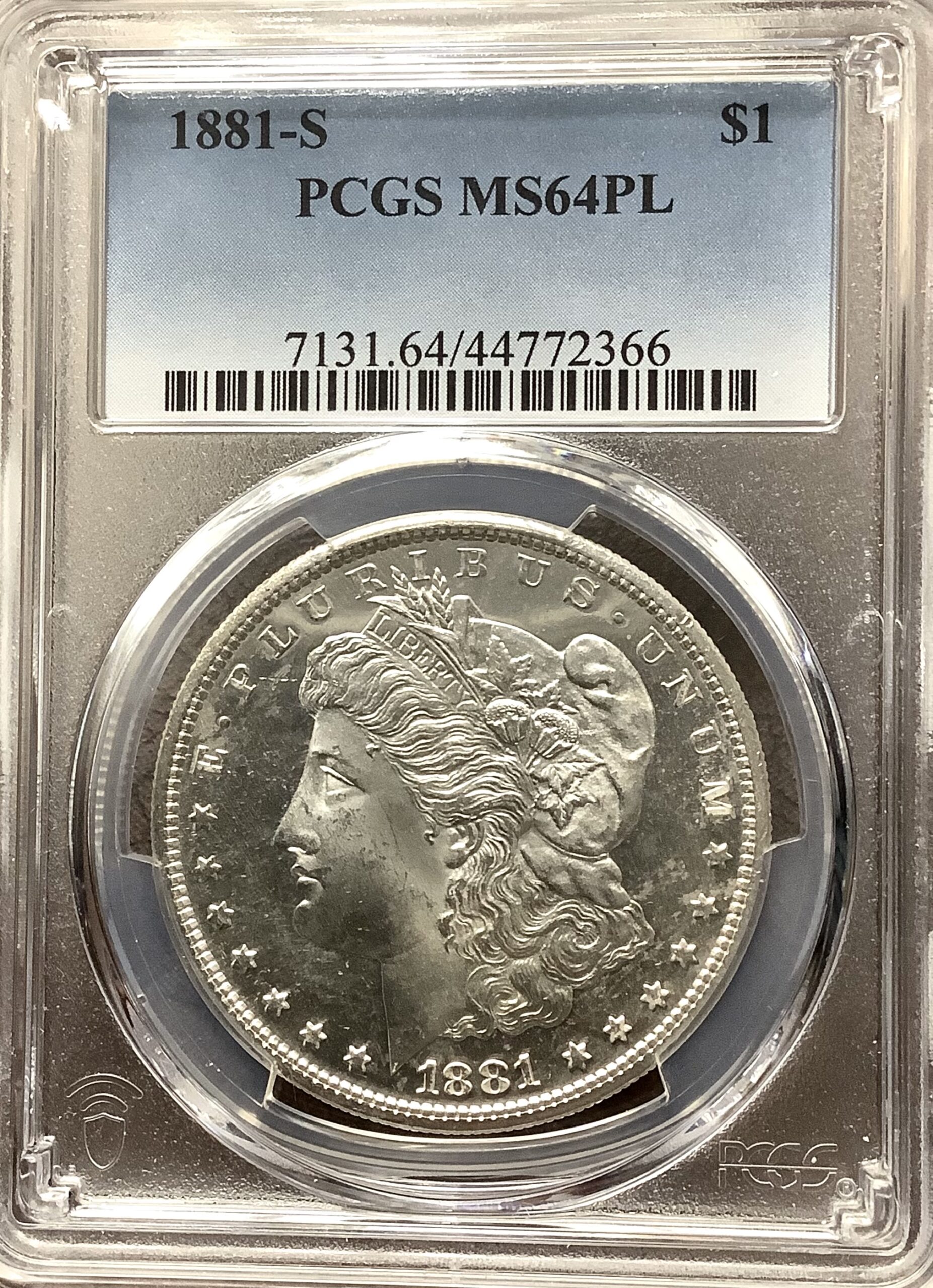 1881-S Morgan Silver Dollar in an older blue holder graded PCGS MS64 PL housed in an older blue holder with Series and Coin Number from circa 1998-2002. Gorgeous coin with sharp contrast between the frosty white portrait and eagle and all lettering against the darker, highly reflective fields. SPlendid eye appeal for the Morgan Dollar PL enthusiast!