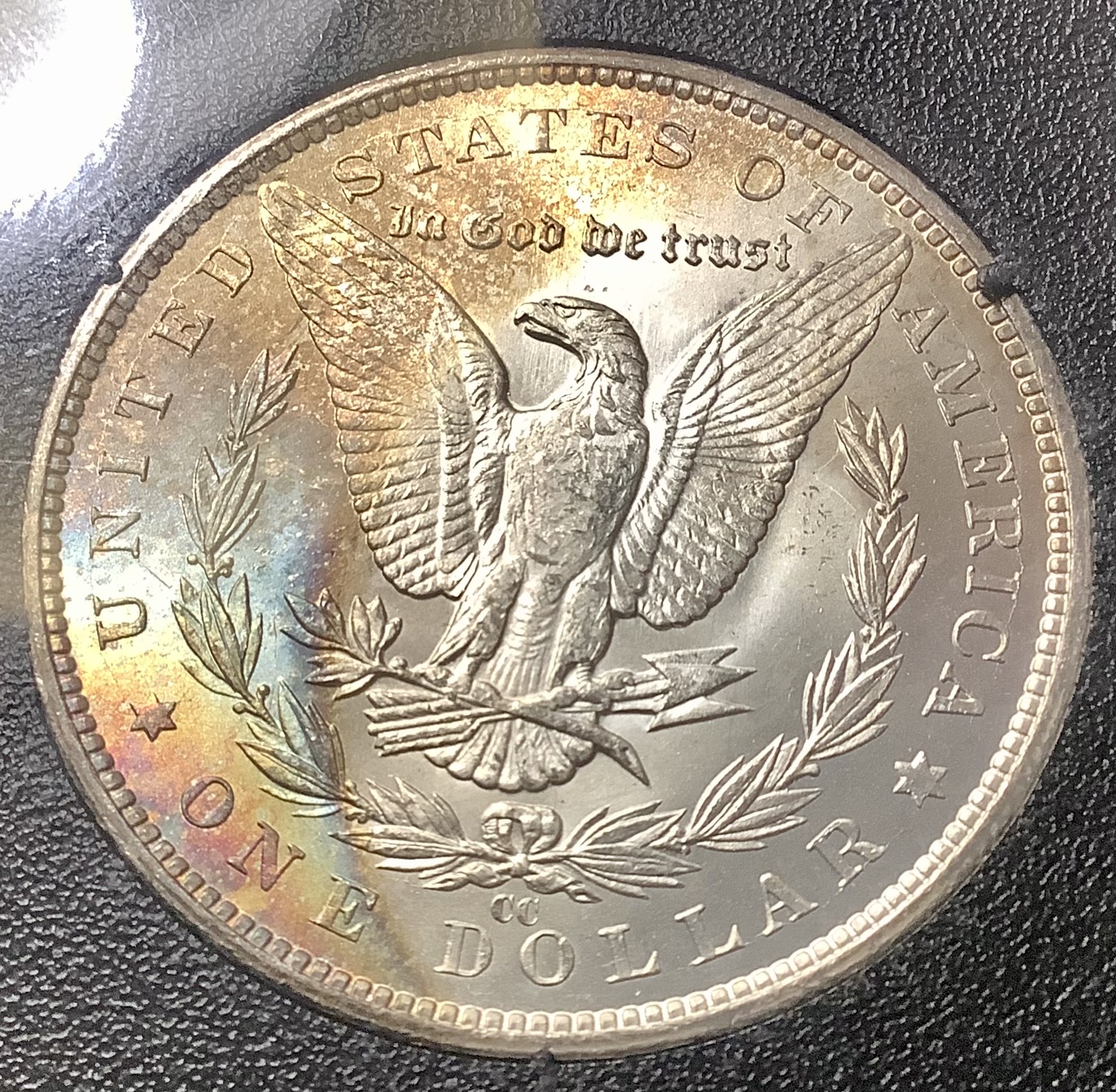 1883-CC Morgan Silver Dollar CACG MS63 GSA Hard Pack Rainbow Toned Reverse