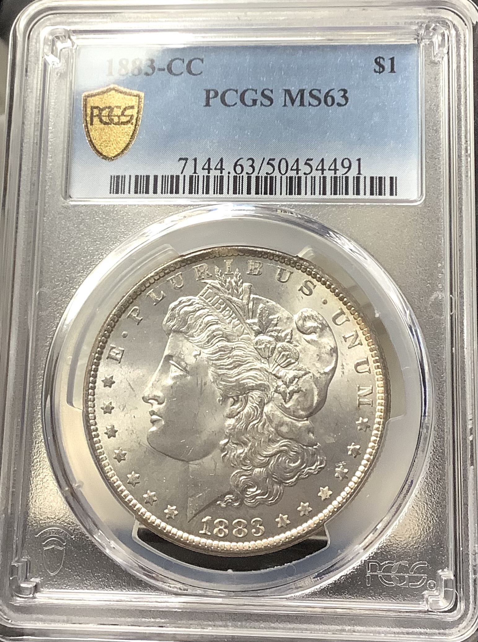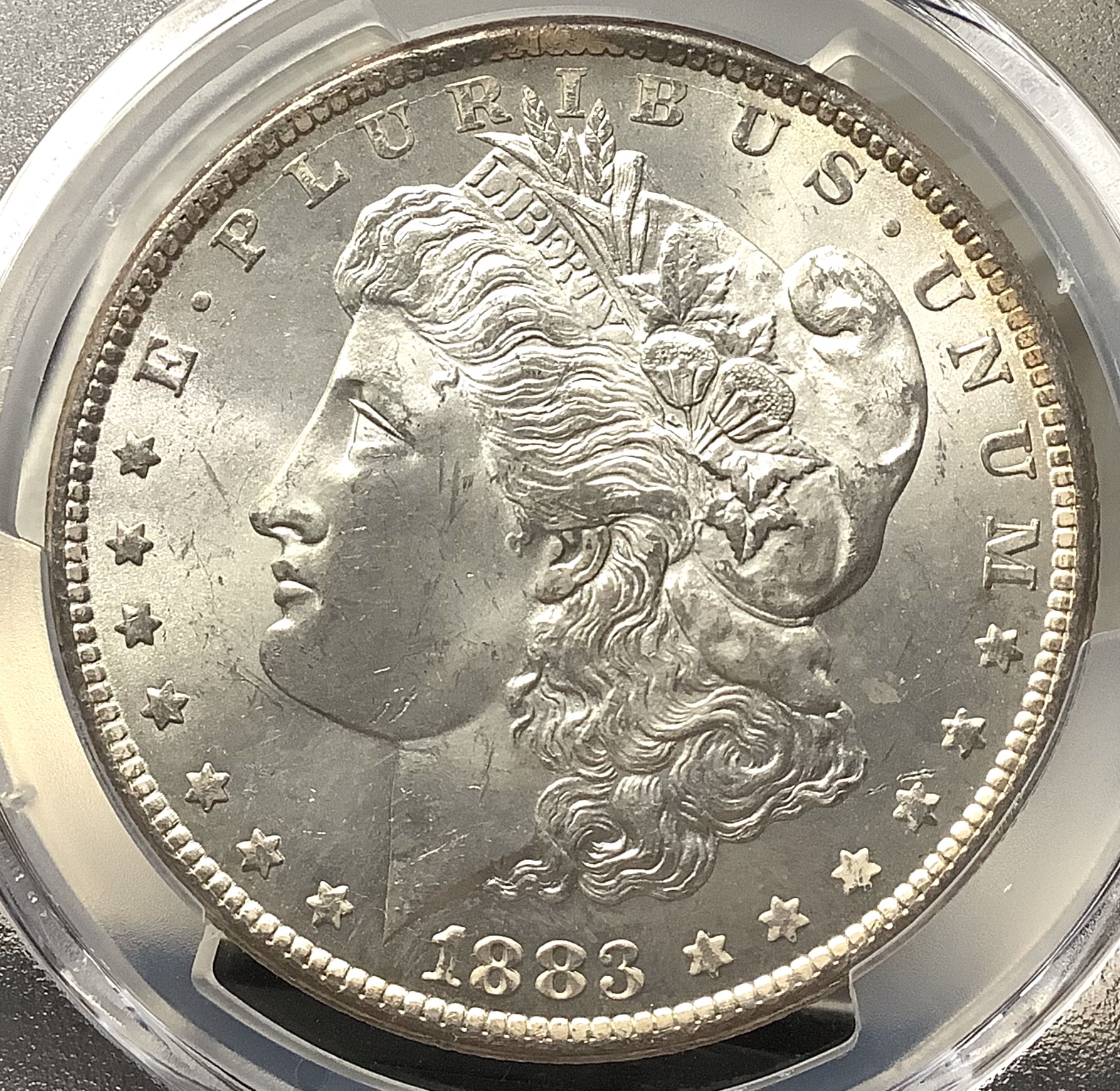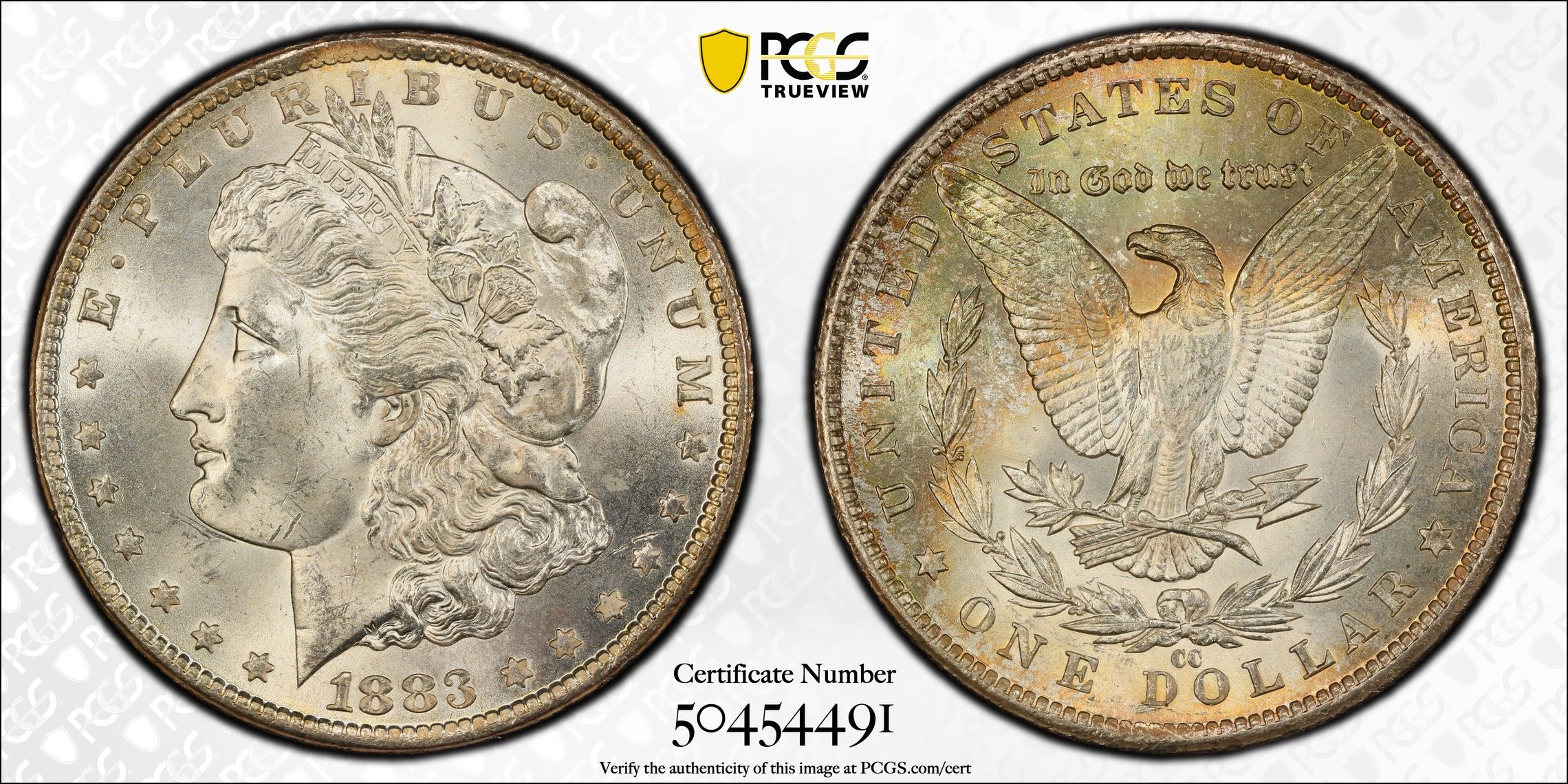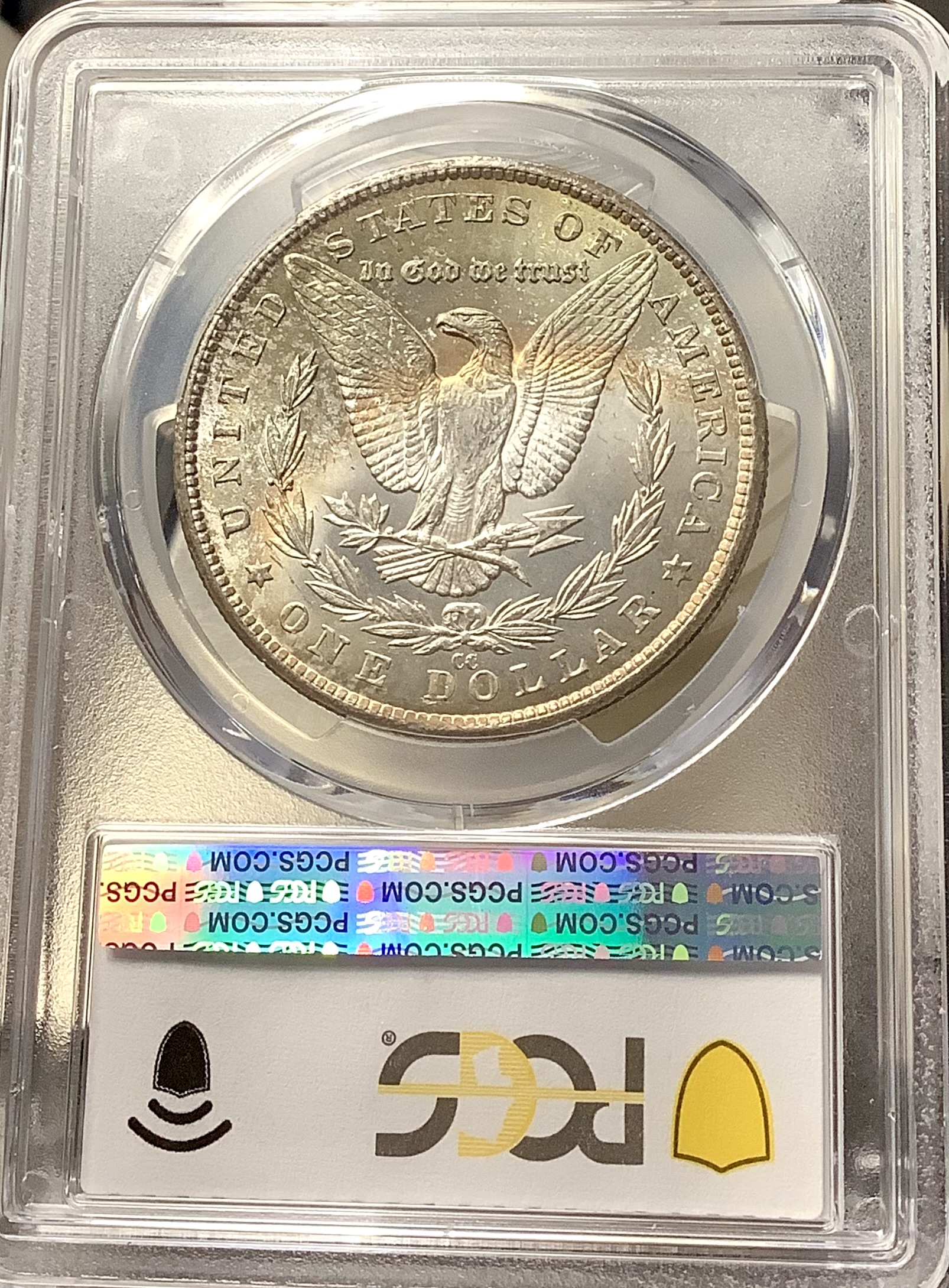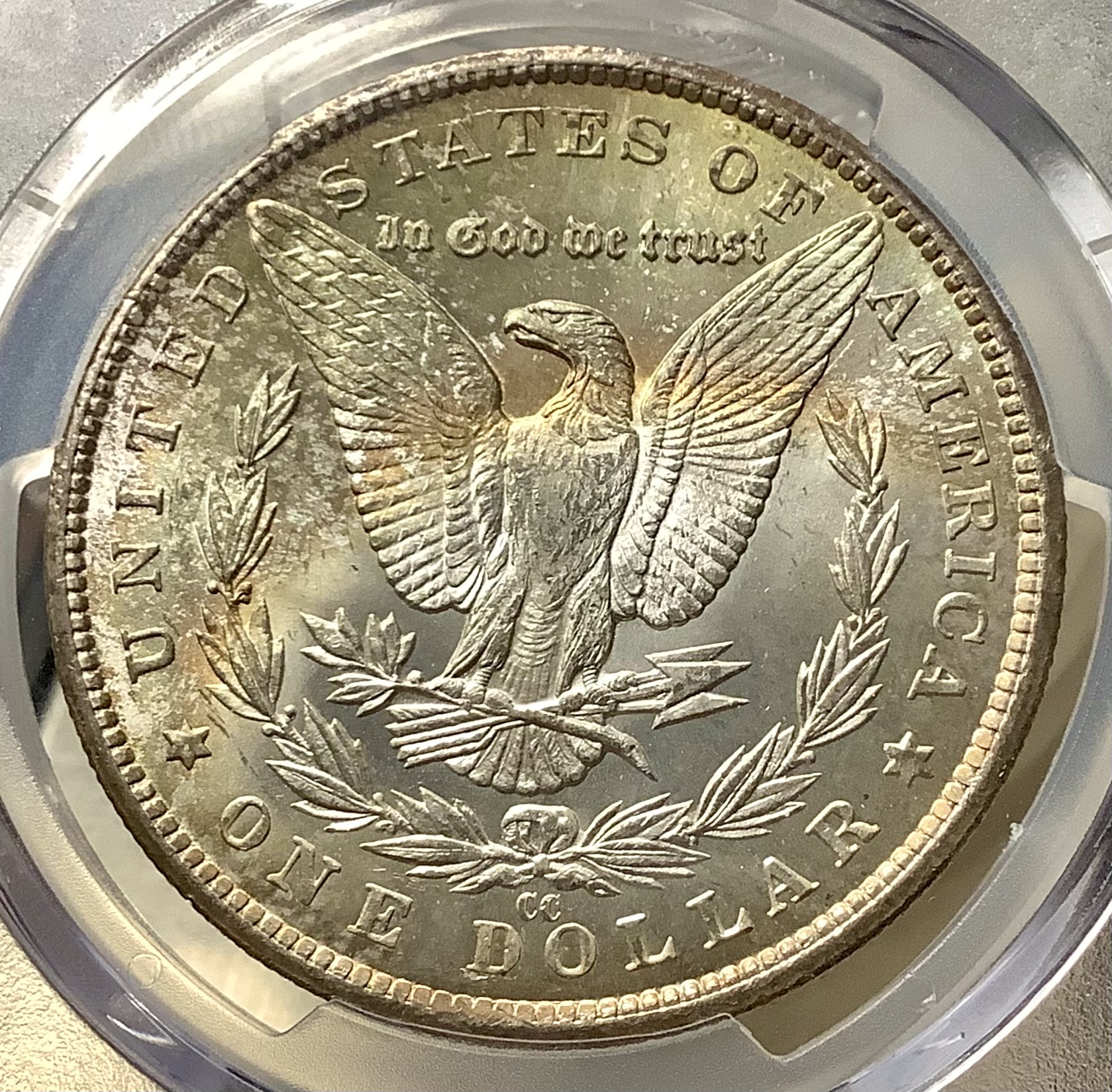 1883-CC Morgan Silver Dollar with colorful crescent toning on the reverse graded last year PCGS MS63