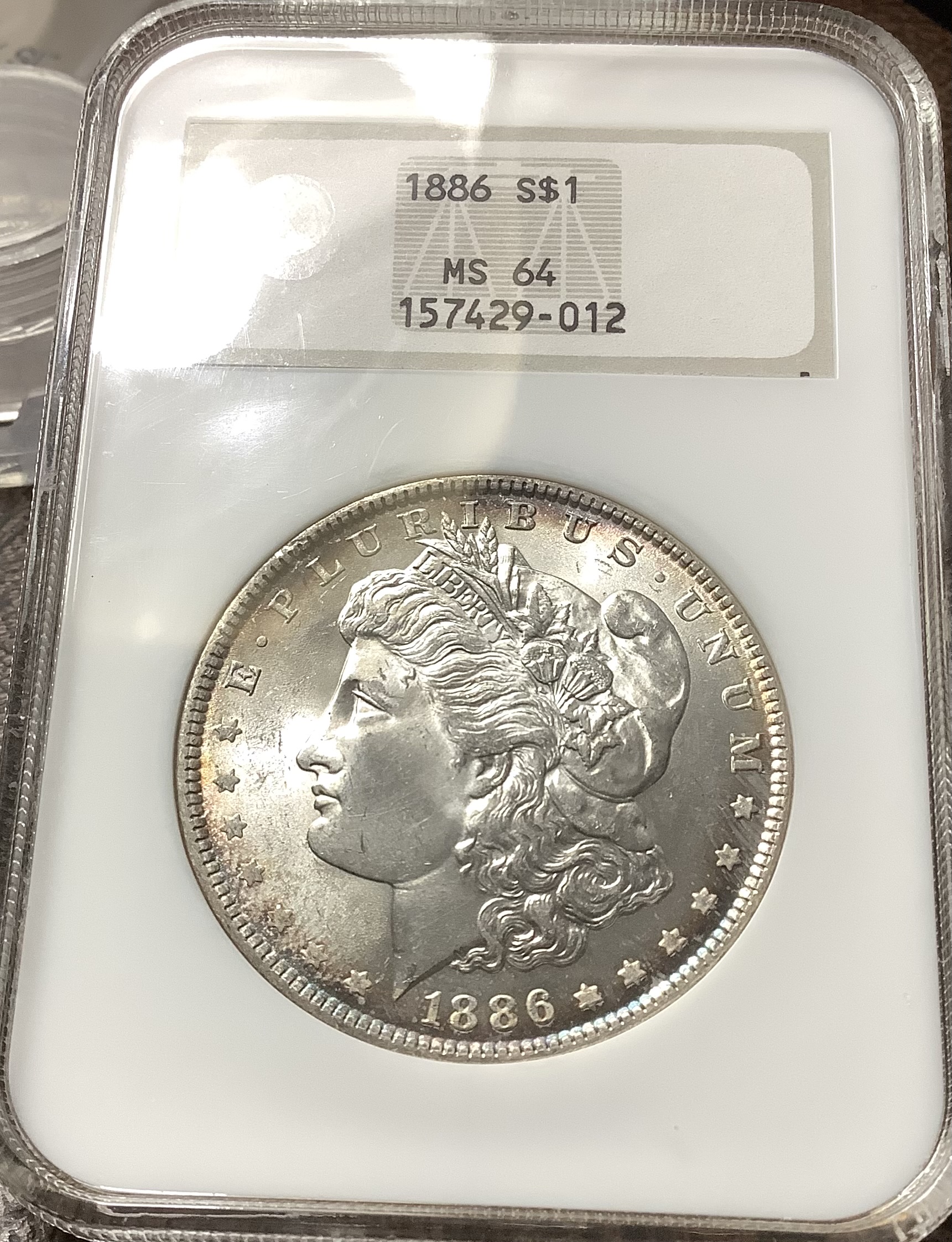 1886 Morgan Silver Dollar – Very PQ Coin – Beautifully Toned Coin with Rich, Full, Thick all original luster. Coin is housed in an older generation NGC No Bar Code Fatty and has been graded NGC MS64.