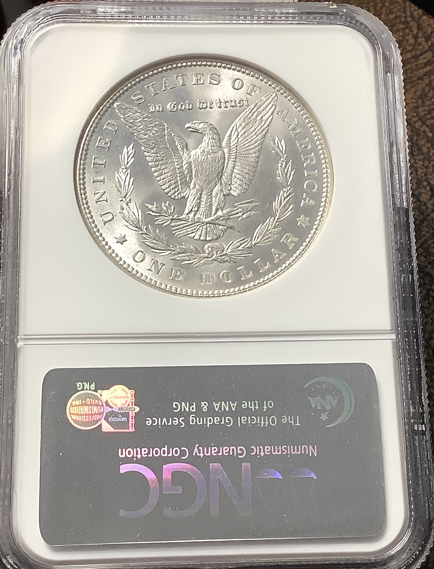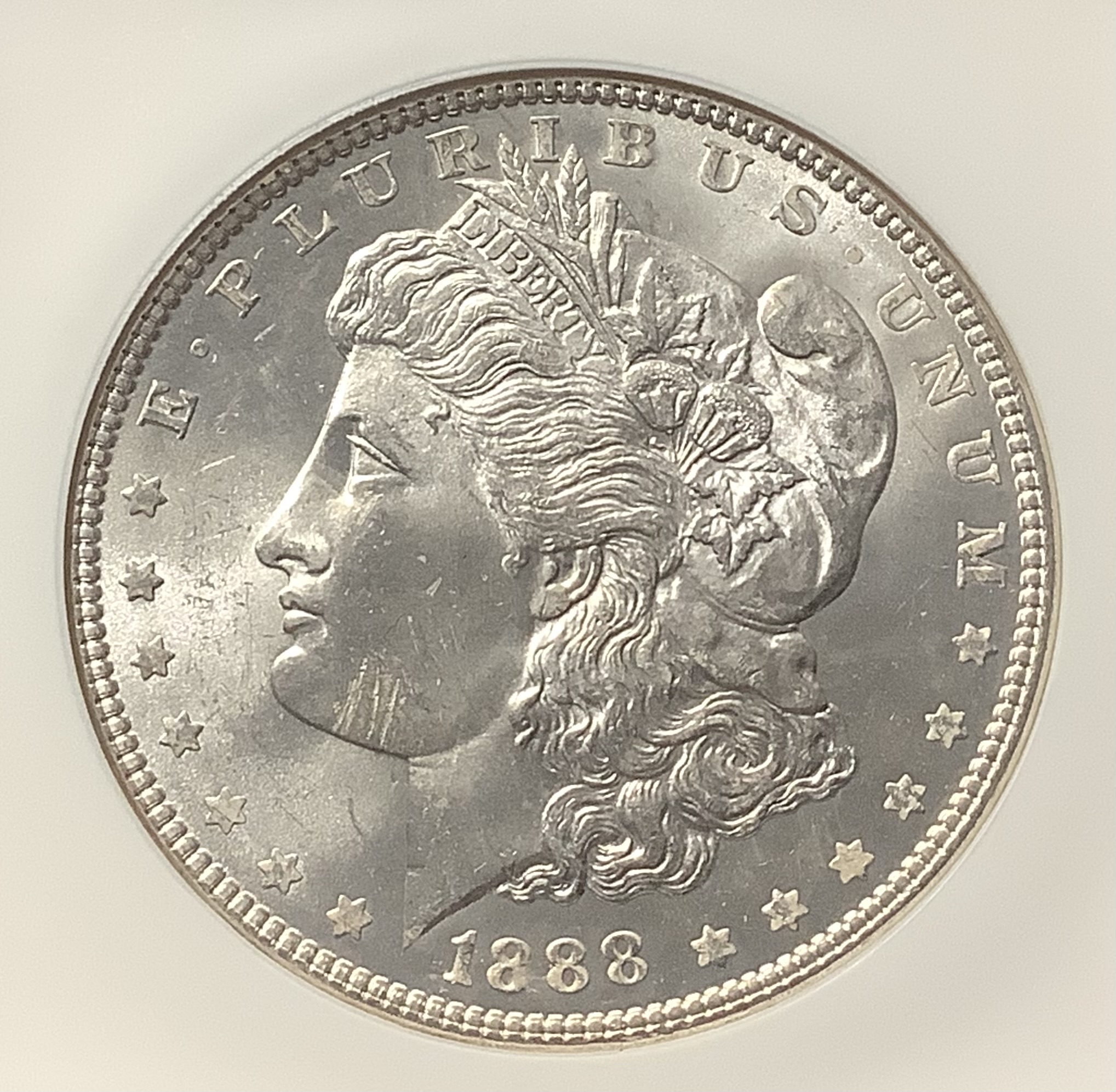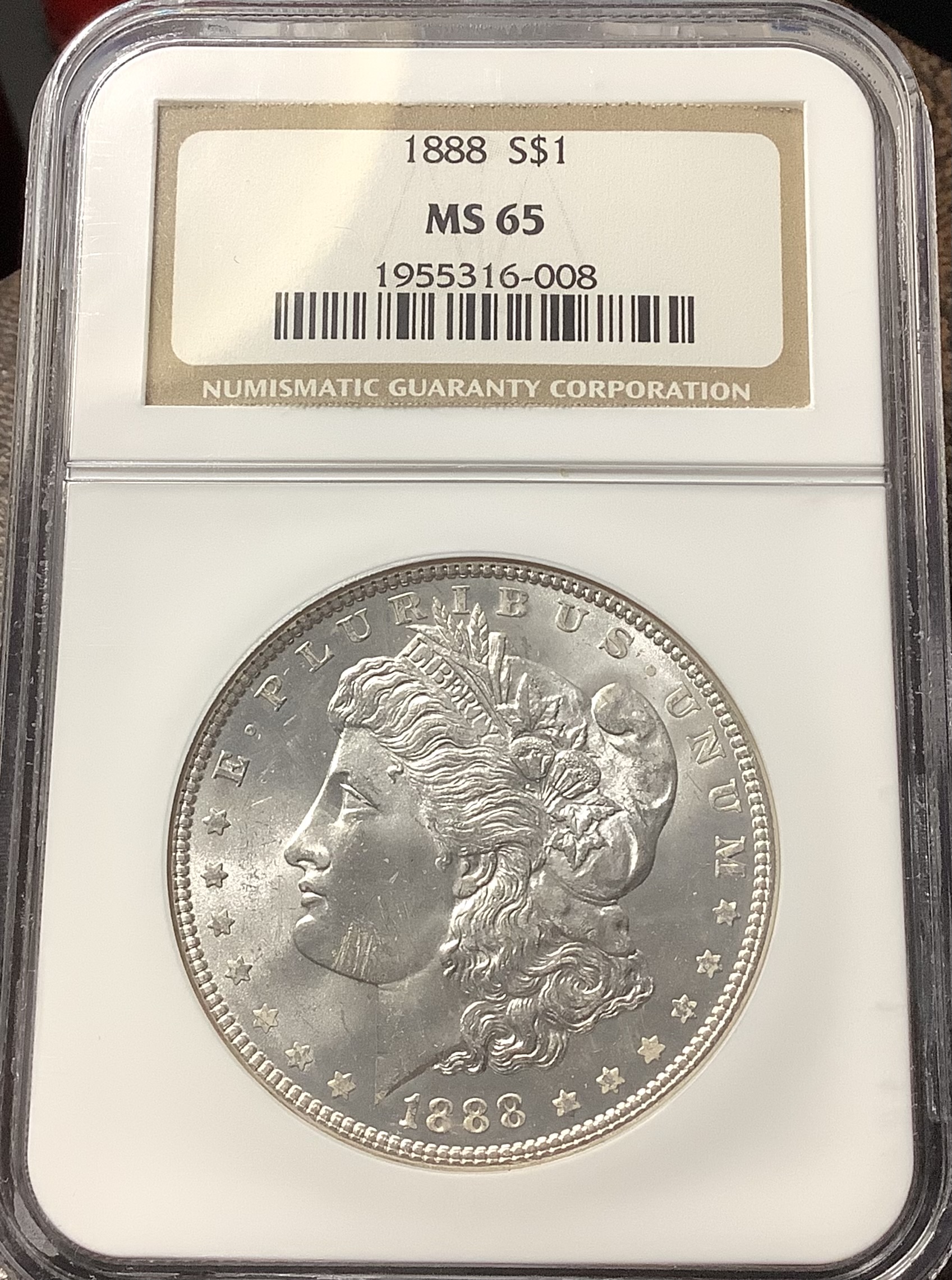 1888 Morgan Silver Dollar – somewhat better date, especially in grades of MS65 or finer. This example is a very lustrous, blast white Gem level coin housed in an older generation NGC slab graded NGC MS65