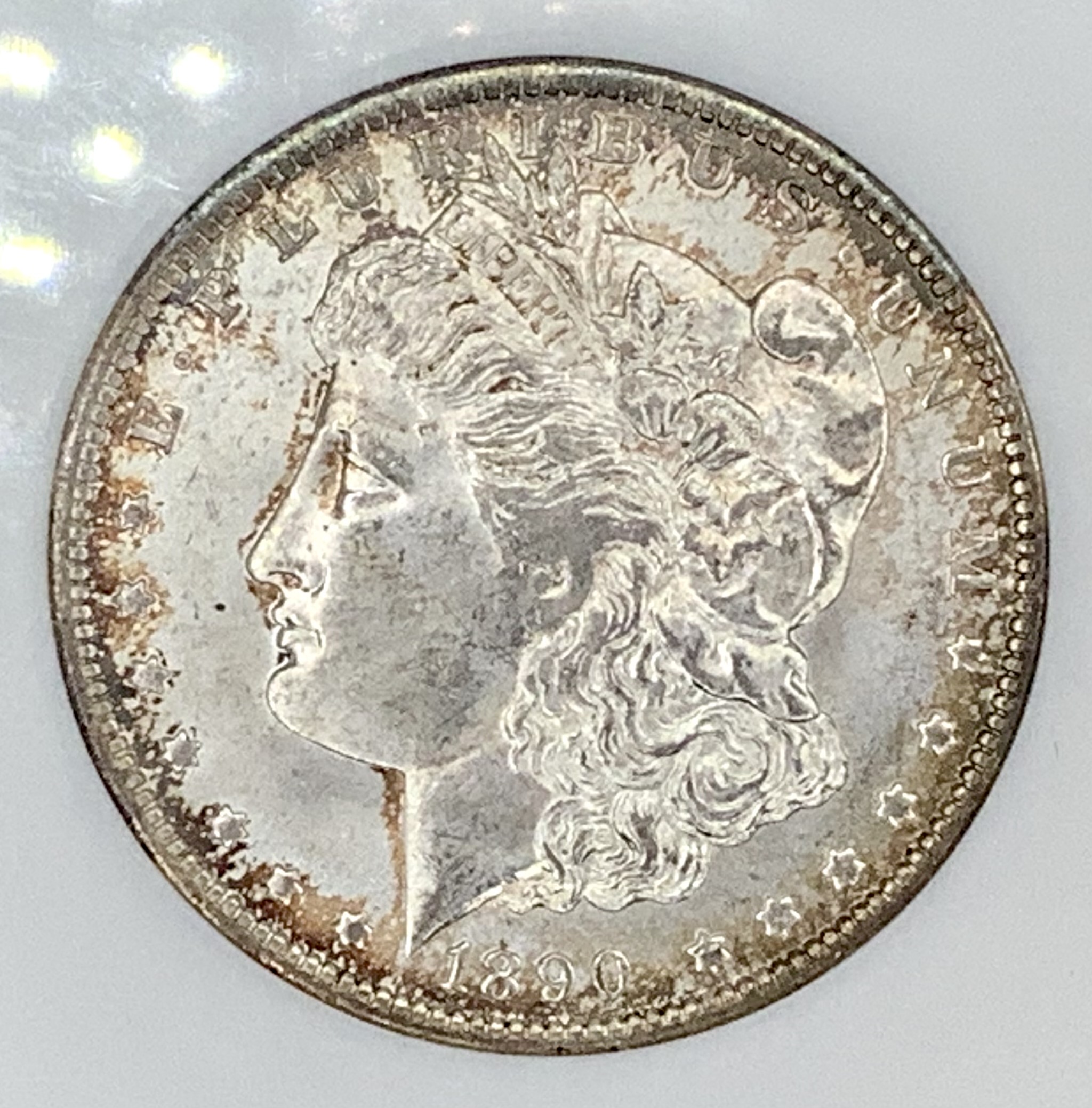 1890-O Morgan Silver Dollar – Very pretty and pleasing antique toning with thick and full original luster. A little flat on the strike is what most likely held the grade to 64 as the luster is superb, contact marks negligible and the eye appeal excellent.