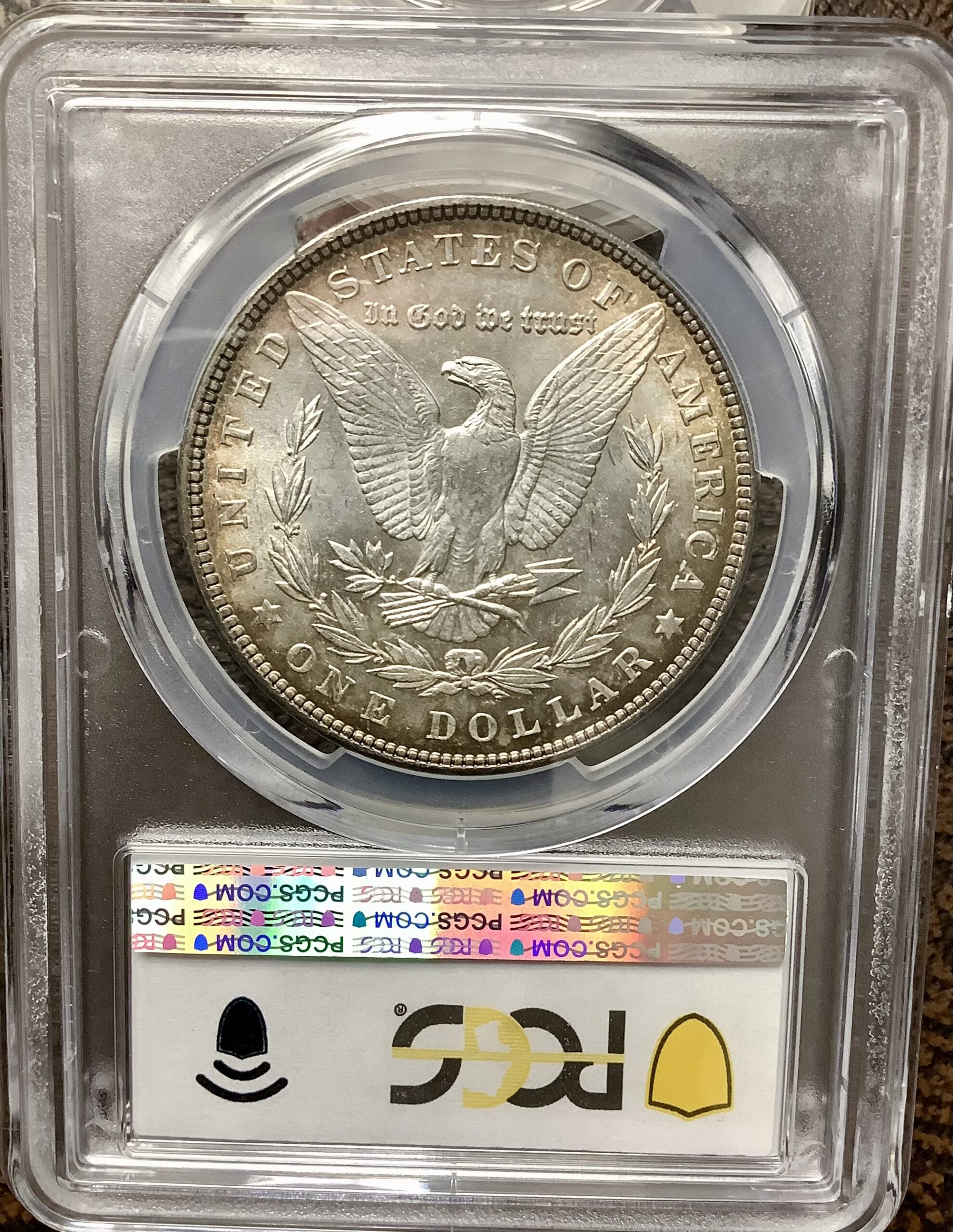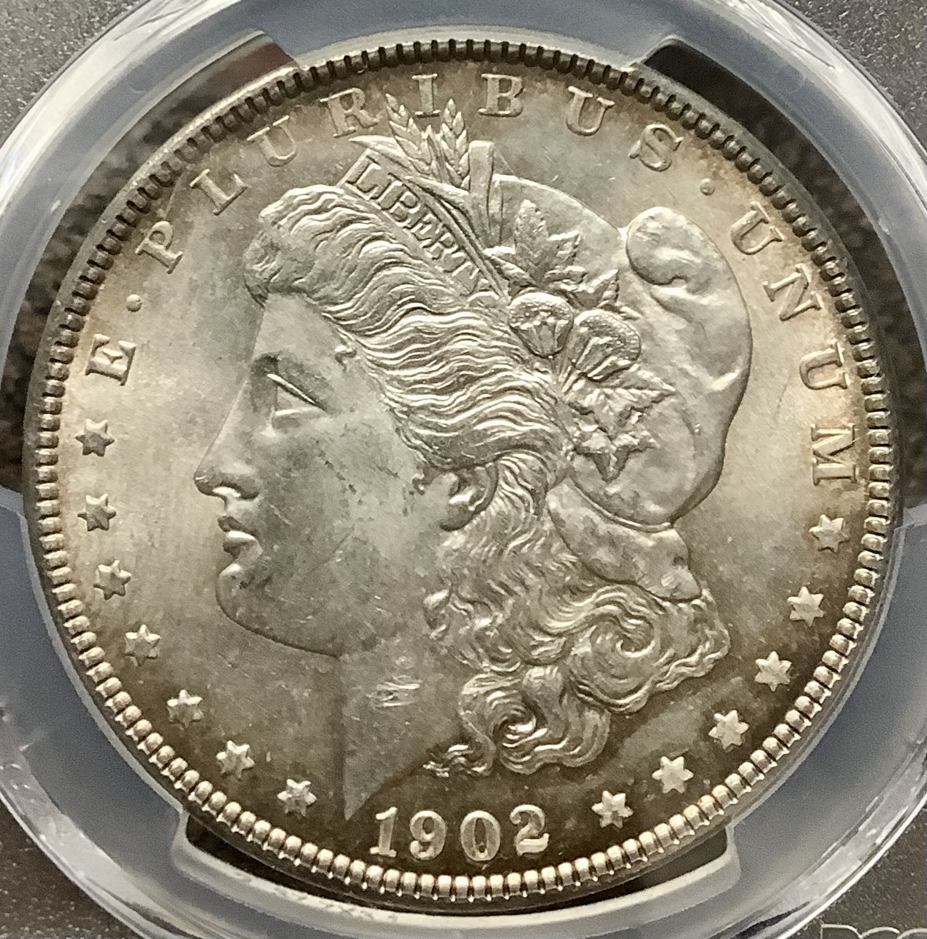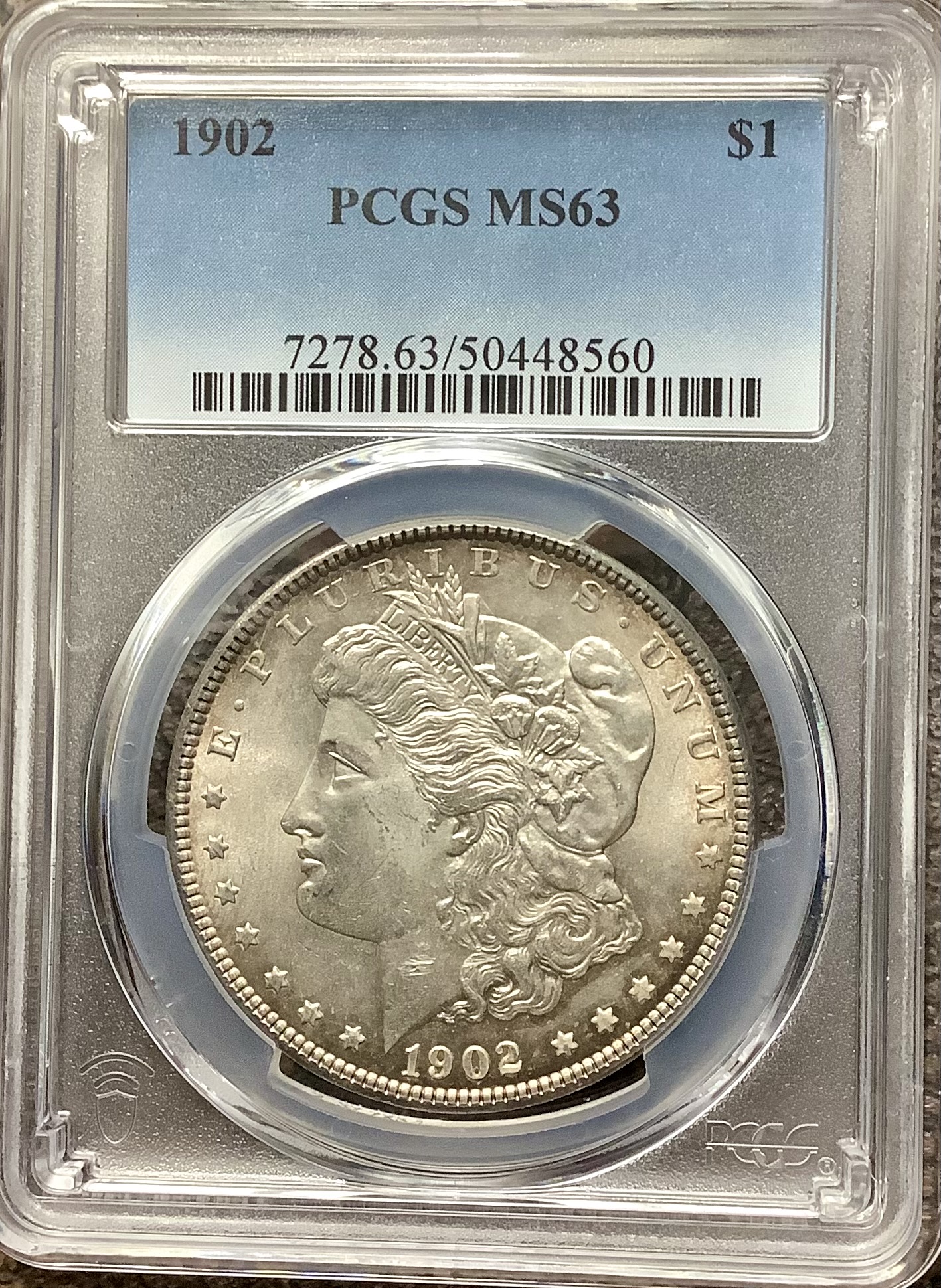 Much better and scarcer date, this lightly toned 1902 Morgan Silver Dollar has been graded PCGS MS63