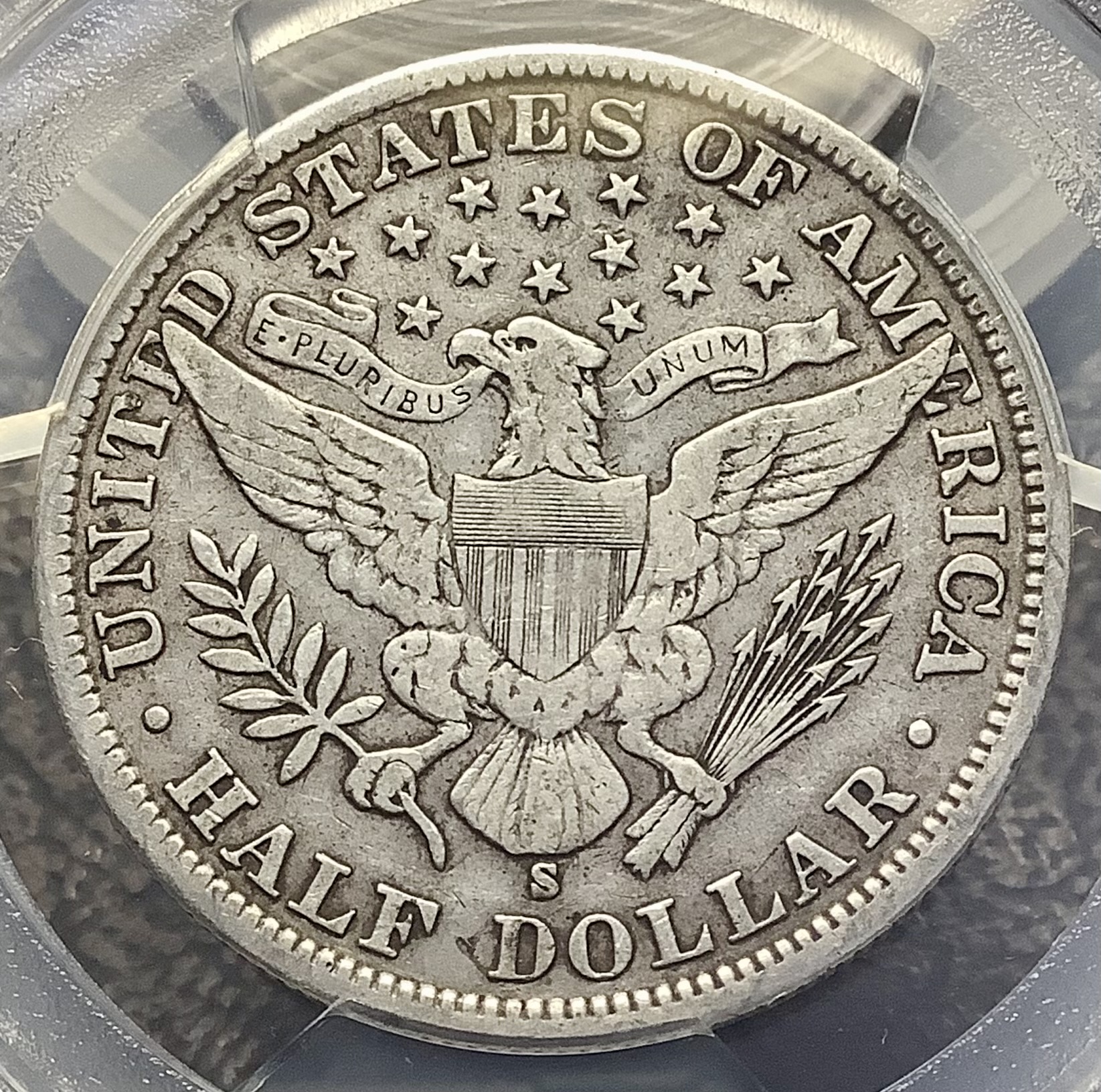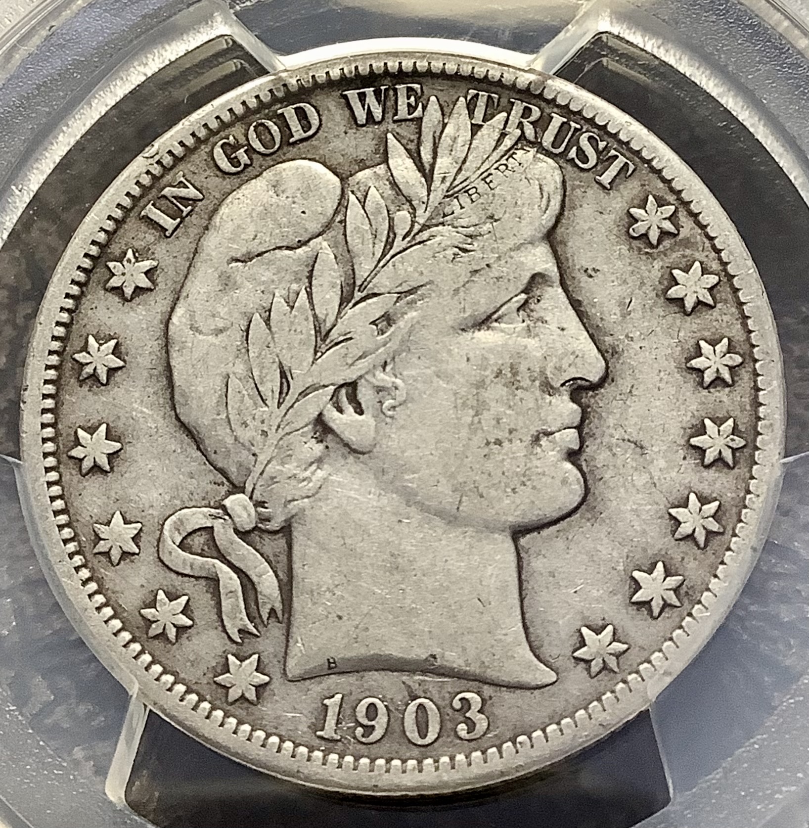 This tougher 1903-S Barber Half Dollar freshly graded PCGS VF30 exhibits a wonderful battleship grey patina. Fully original surfaces are graced by strong detail certainly within the Choice VF Grade as assigned and approaching XF level, albeit and agreeably just shy, the coin wouldnt look out of place in a 35 holder. Full, bold LIBERTY with strong forehead hair and diadem detail along with sharply defined, three dimensional obverse stars. On the reverse, note the eagle wing feathers stretch to the tips and the neck and claw feathers are more than 75% full. The horizontal shield lines are bold even in the pesky top right facing corner. No real original mint luster remains at this level which is the most likely factor utilized to determine the fragile line of separation between VF30, 35 and the XF levels.