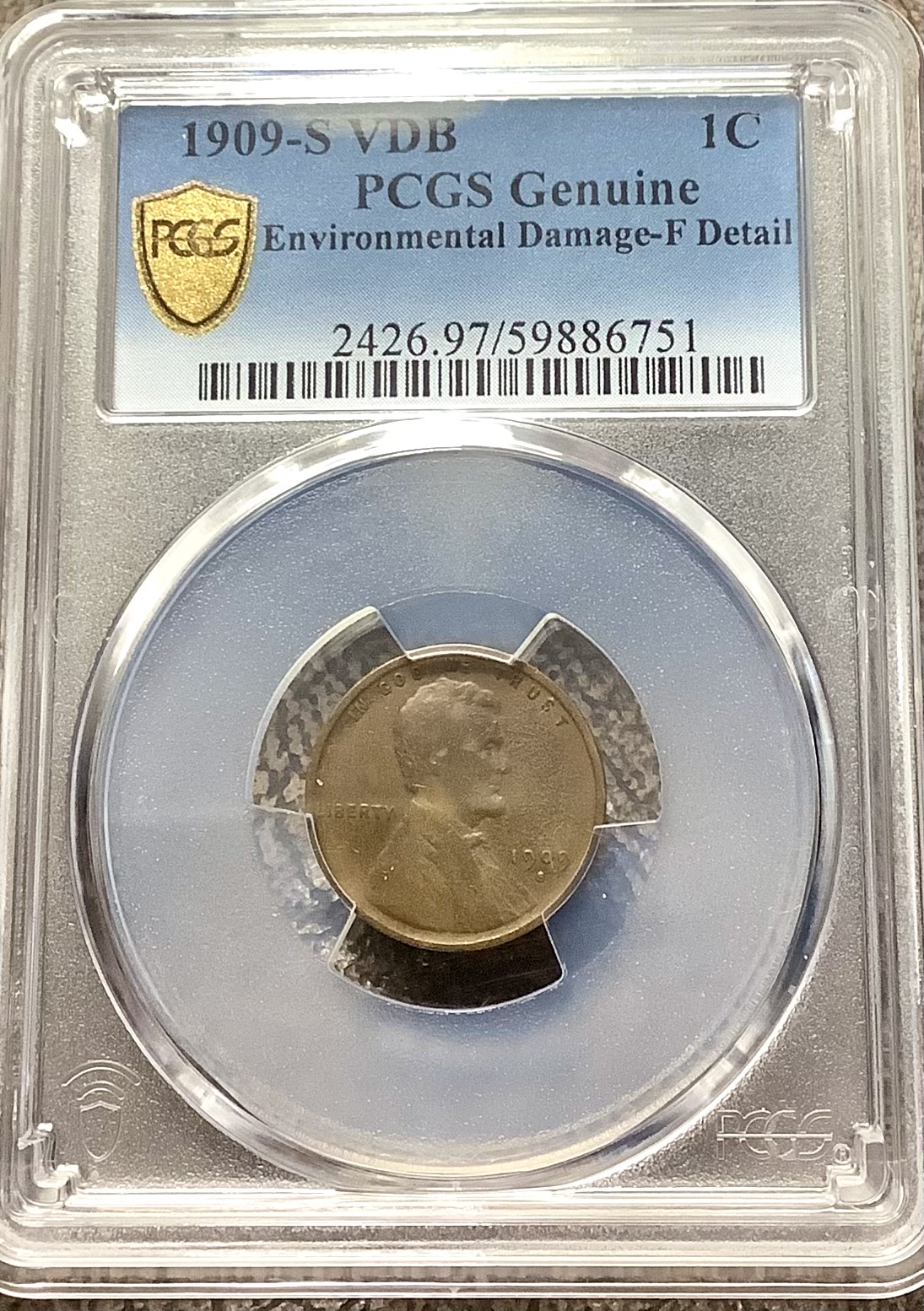 Key date 1909-S VDB King of the Lincoln Cents graded PCGS F Detail, Environmental Damage