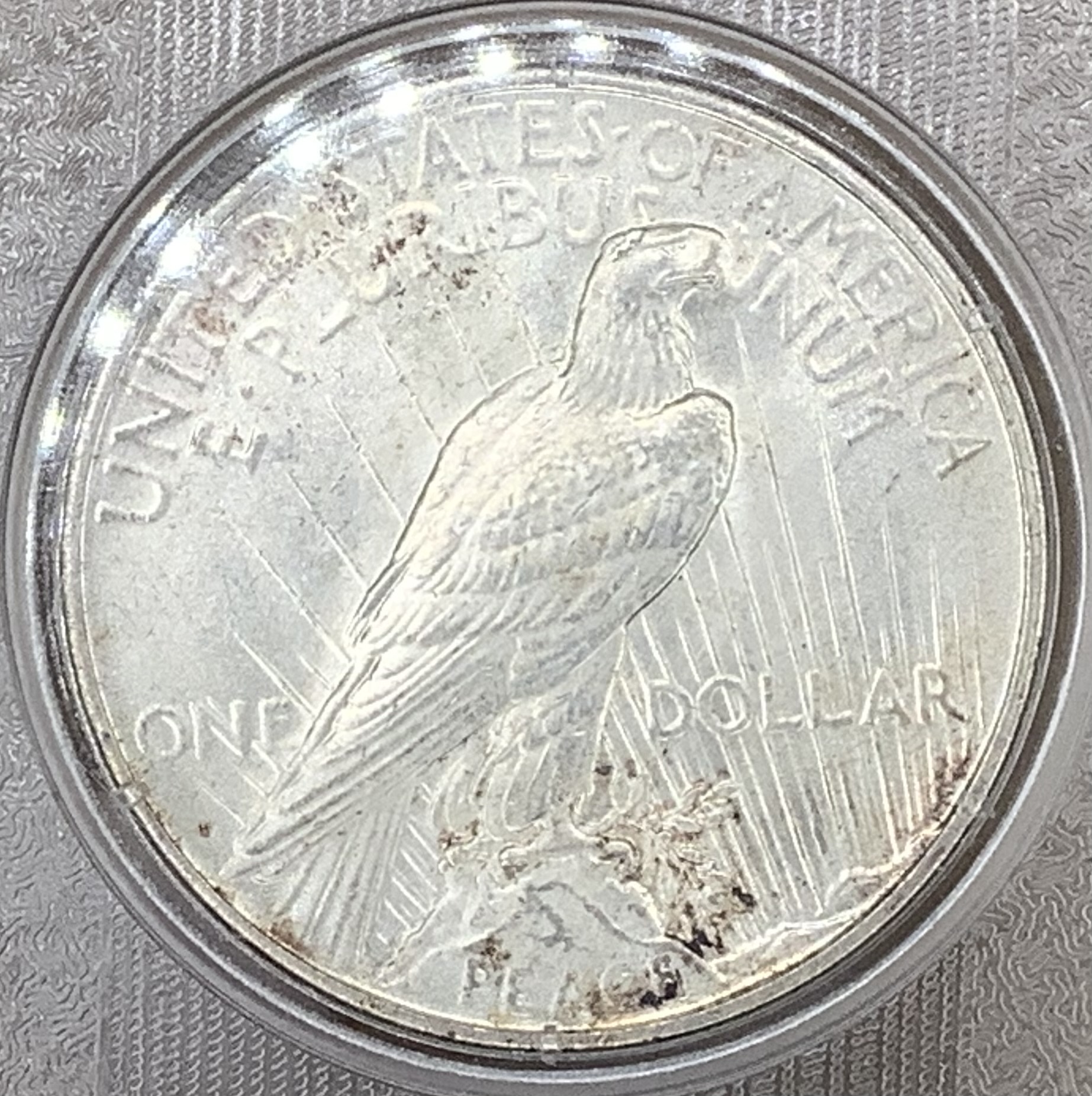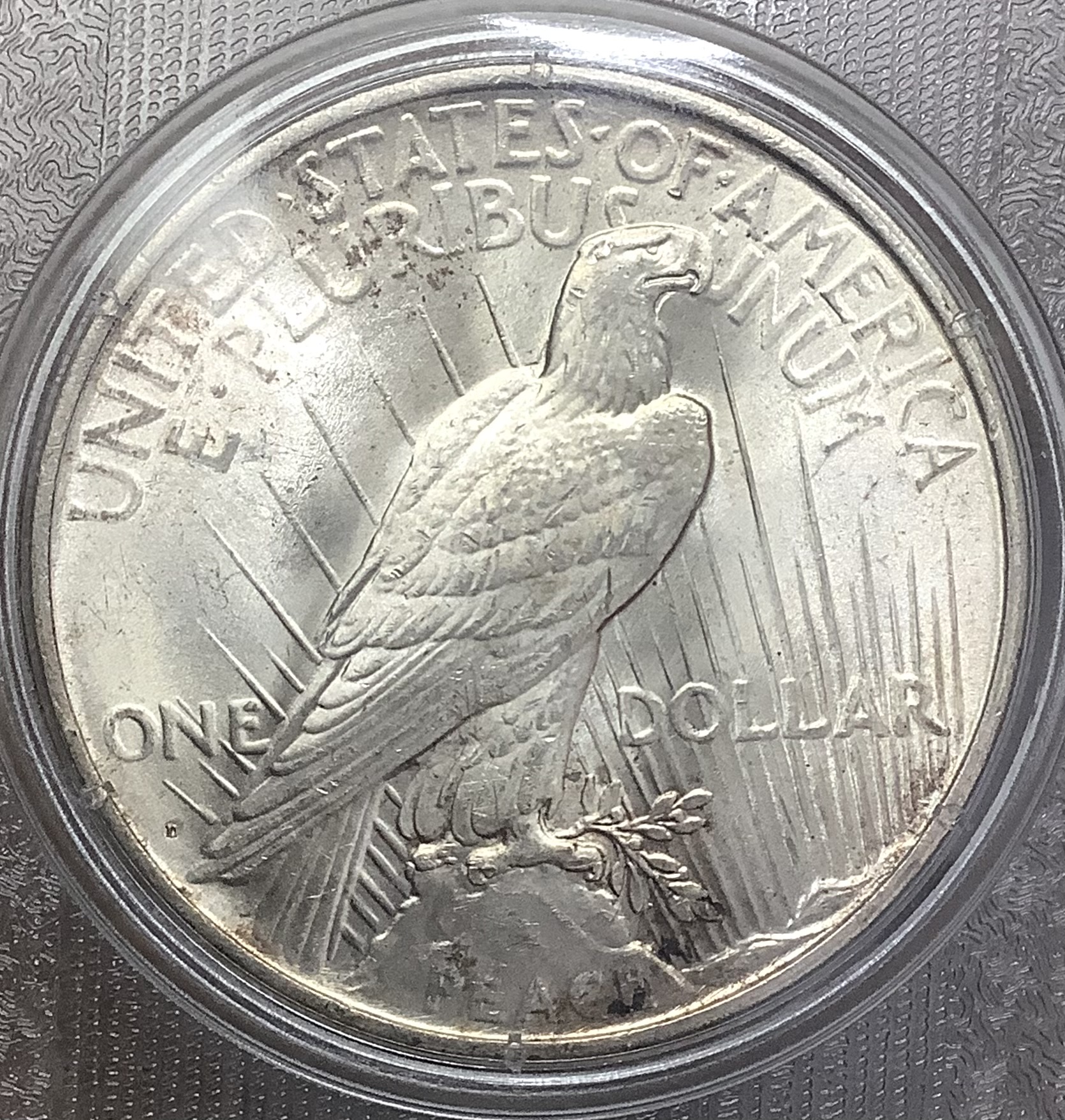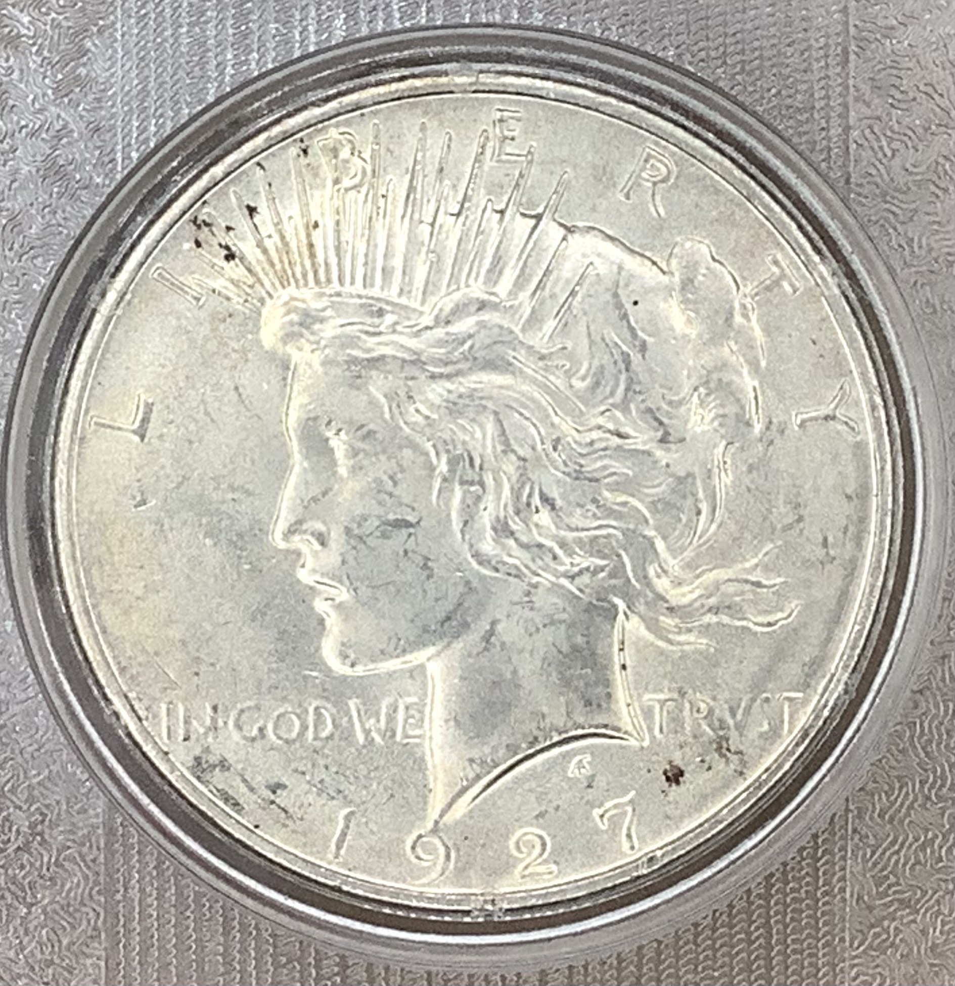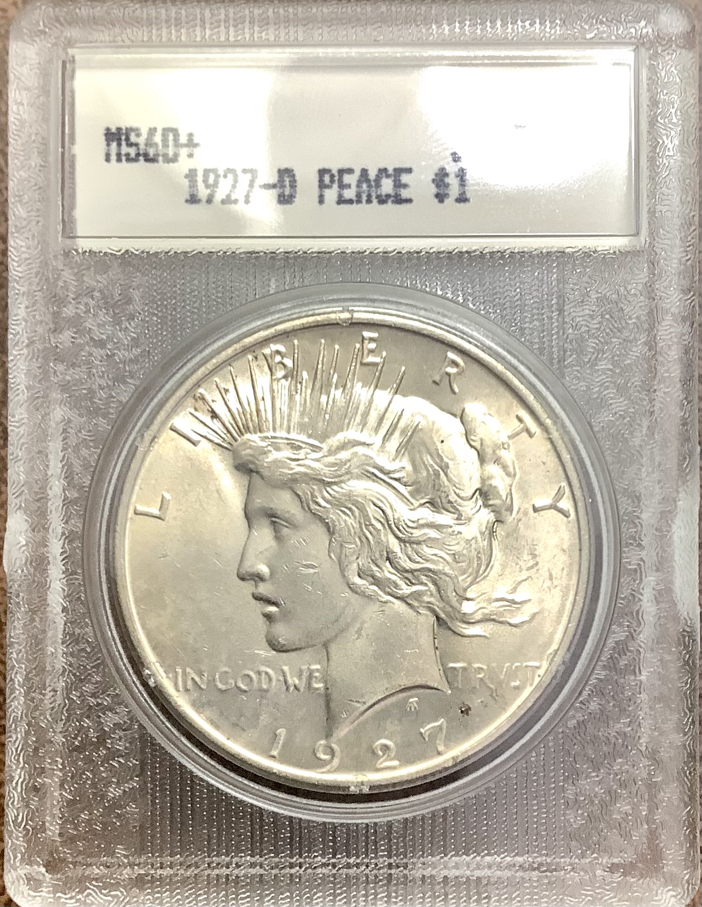 Product: 1927-D Peace Silver Dollar Lustrous Choice BU in Vintage Blanchard Slab Semi Key