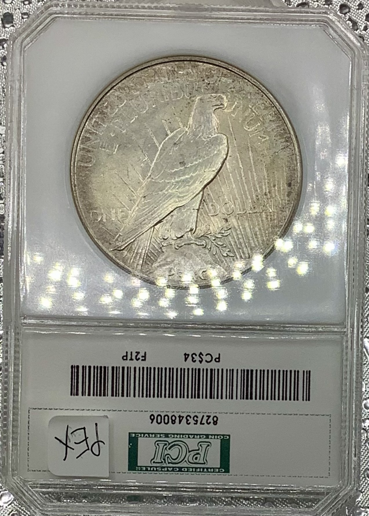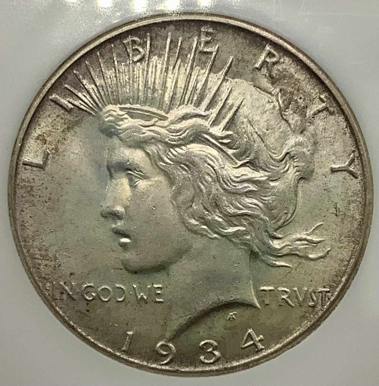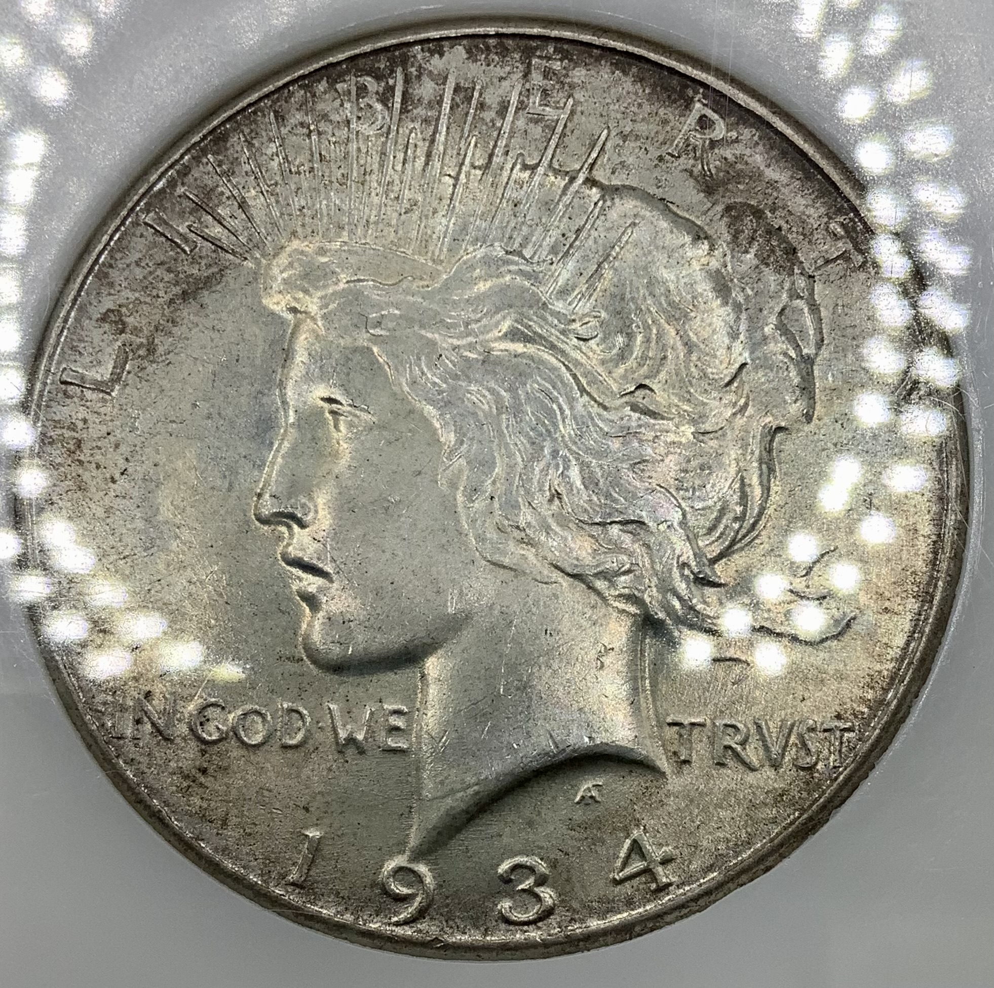 Product: 1934 Peace Silver Dollar Pastel Toned *COLOR* PCI Green Choice BU 90% Silver