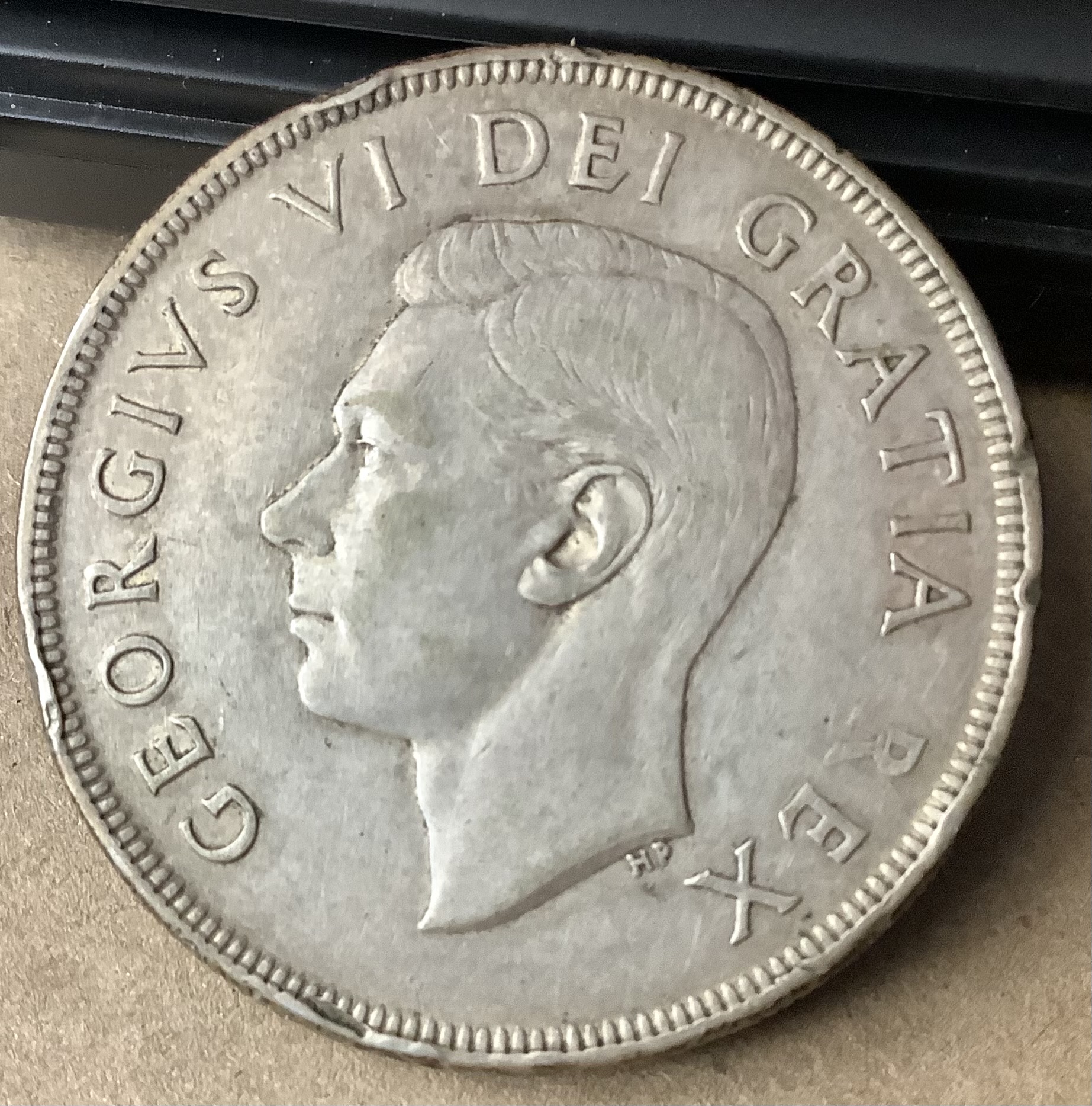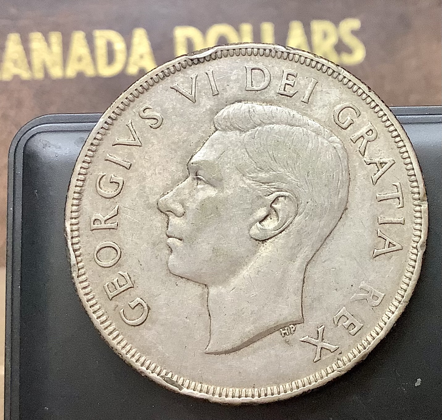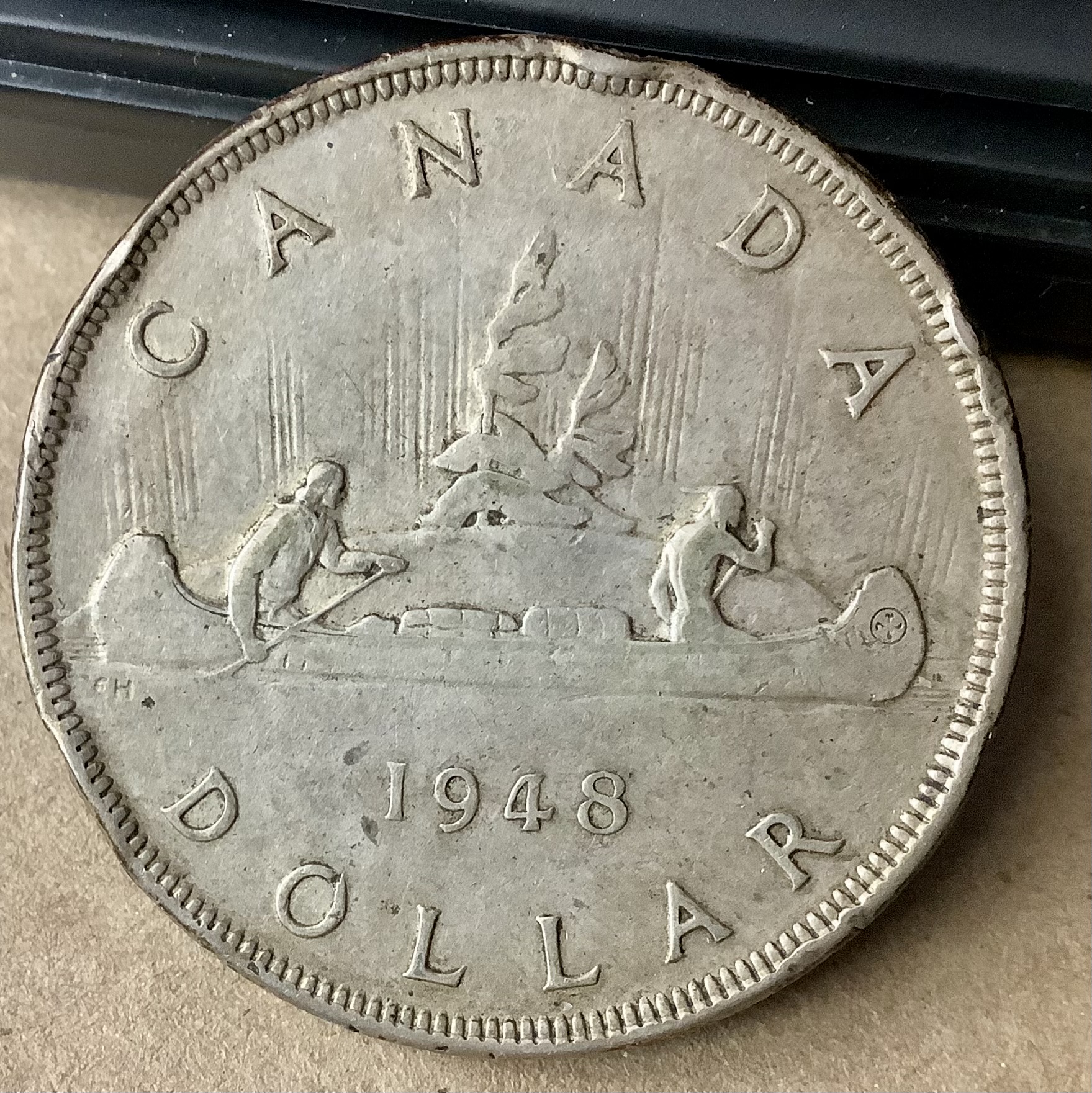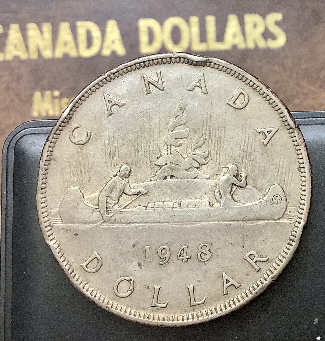 Coin has a several areas of rim damage and retains VF Detail. Regardless, it is still a genuibe 1948 Canada Dollar with a tiny mitage of just ovre 18,780 pieces struck – an elusive coin to find in any grade, KM #37
