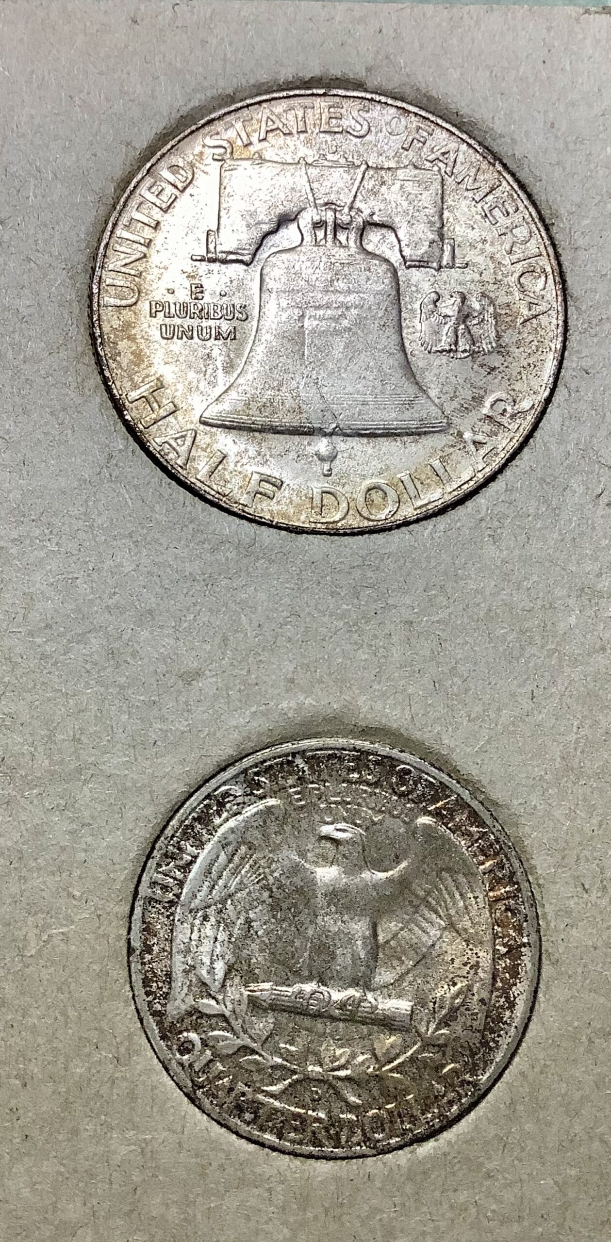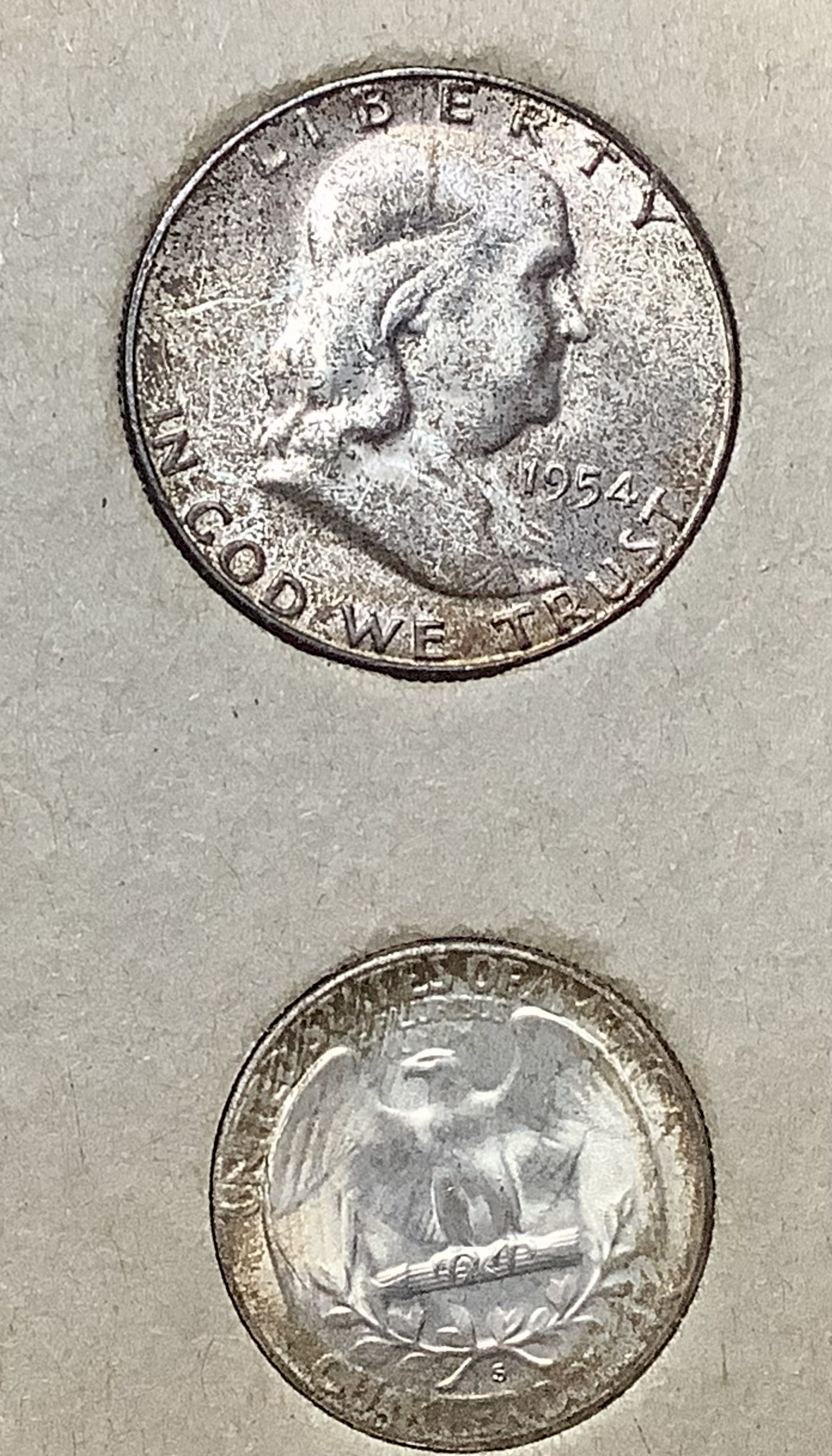 Coins in these sets almost always deeply tone up mainky due to the high sulfur content in these coin boards. These coins are absolutely original as attested by the thick toning and patina on all of them. Rich color, deeply toned on all thge silver coins. The Lincoln Cents have managed to maintain a rich, cherry red color and the Nickels are probably the least toned of them all