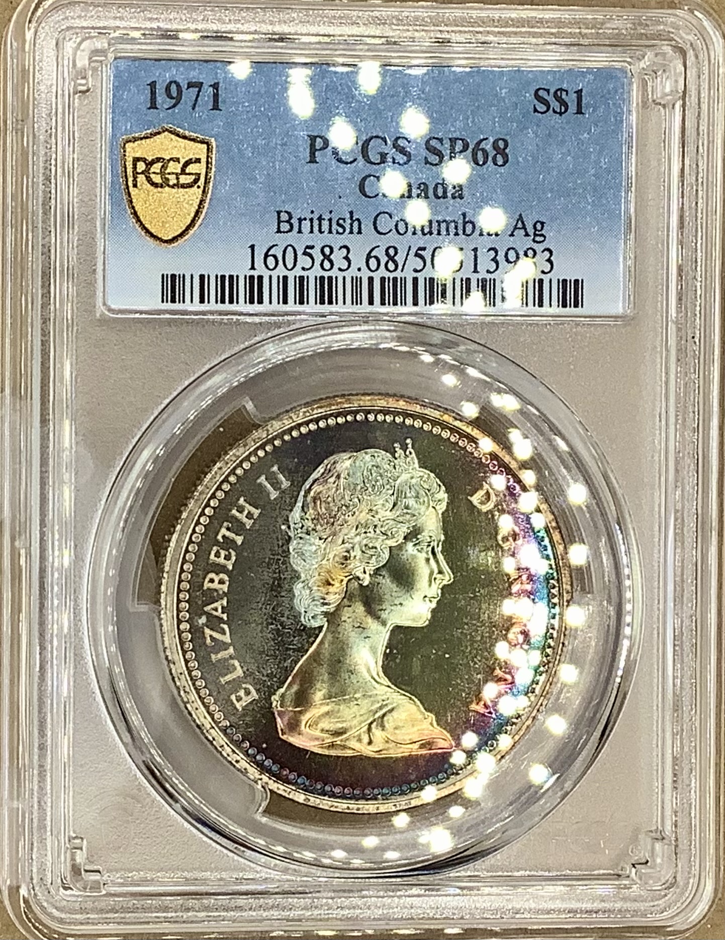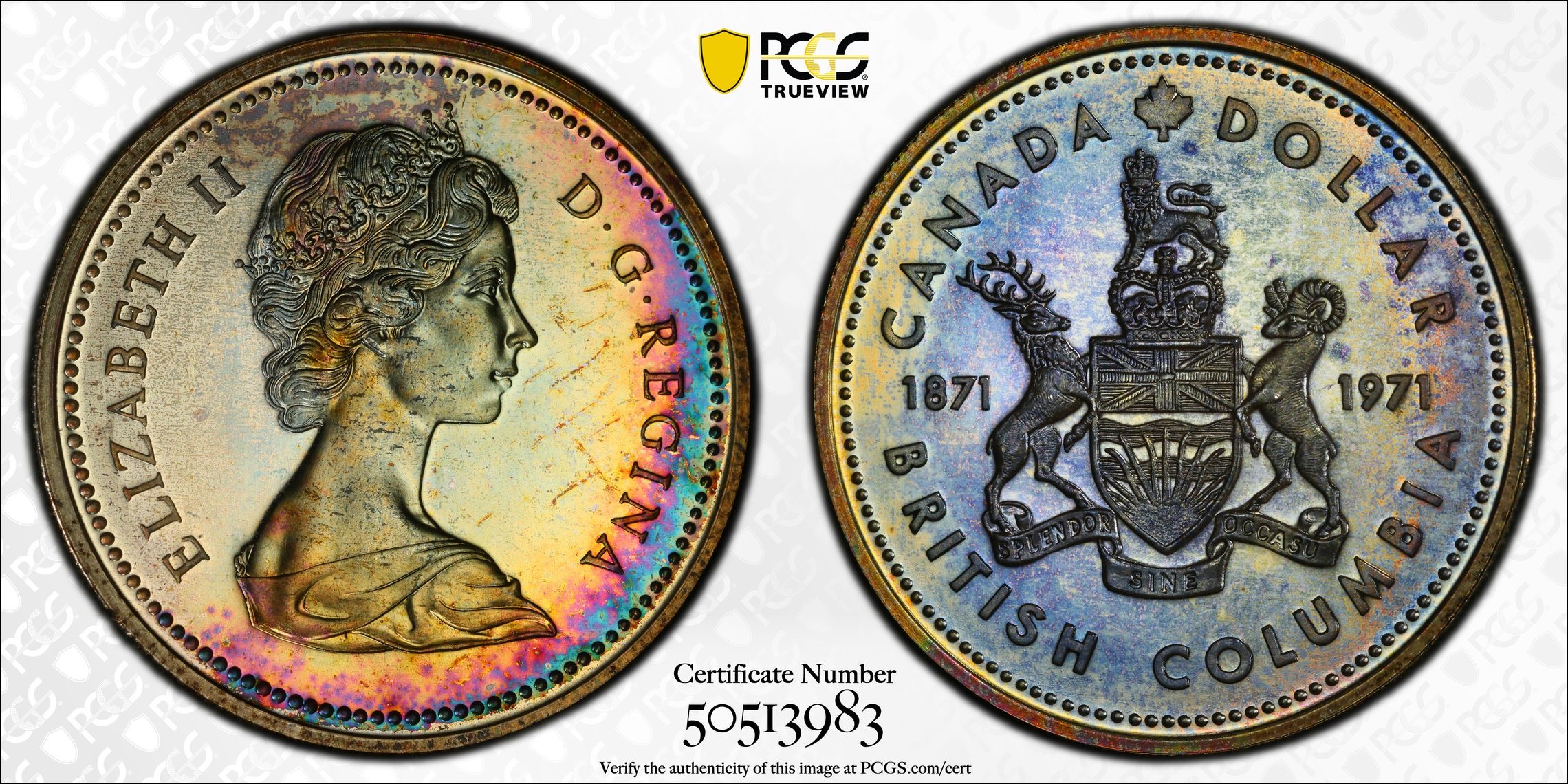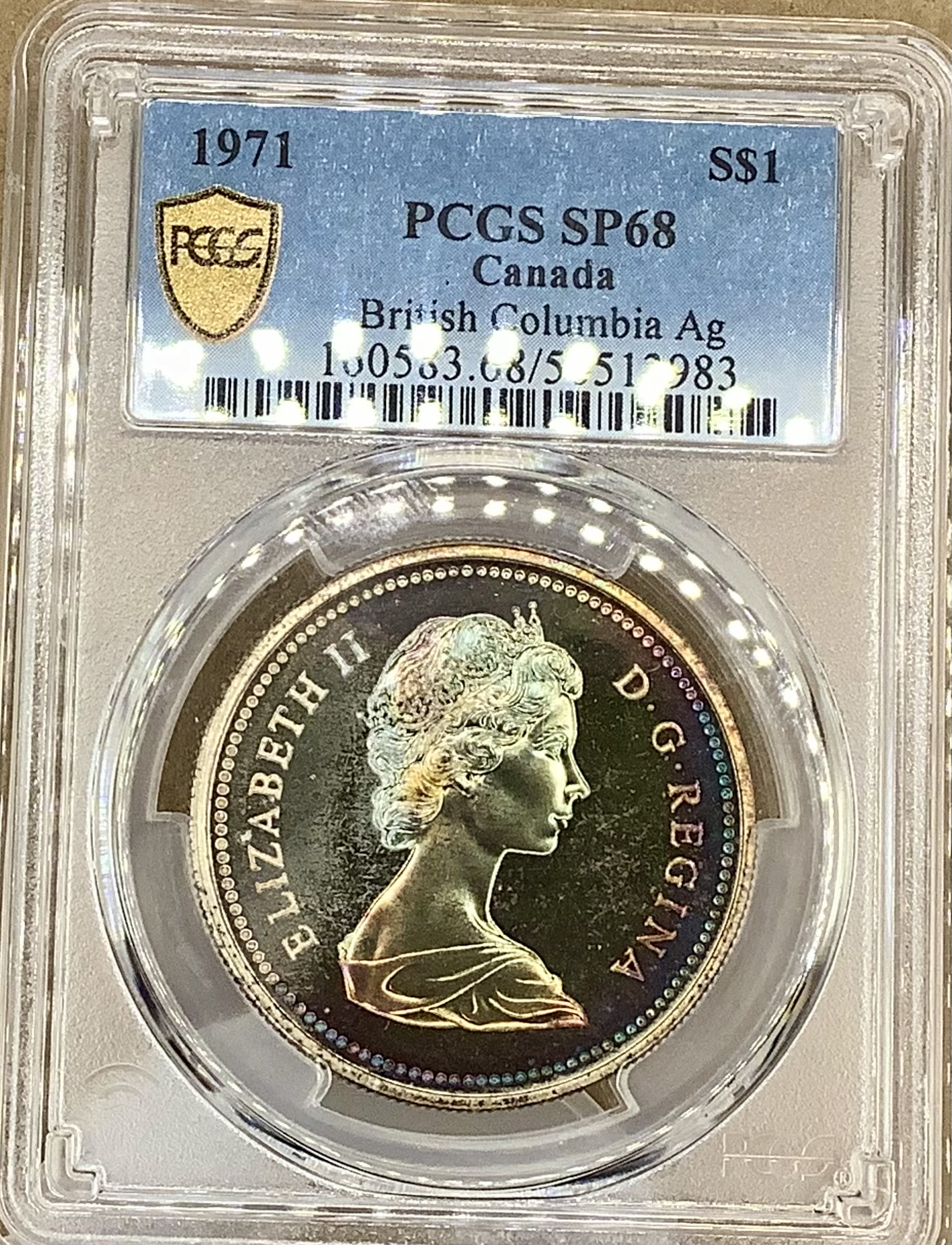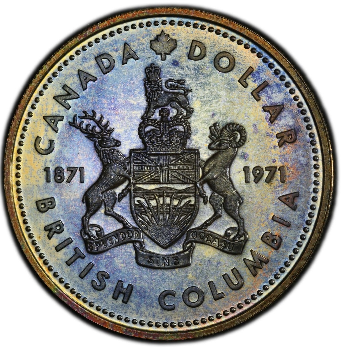 Product: 1971 Canada .500 Silver Specimen British Columbia Dollar PCGS SP68 *COLOR* Toned
