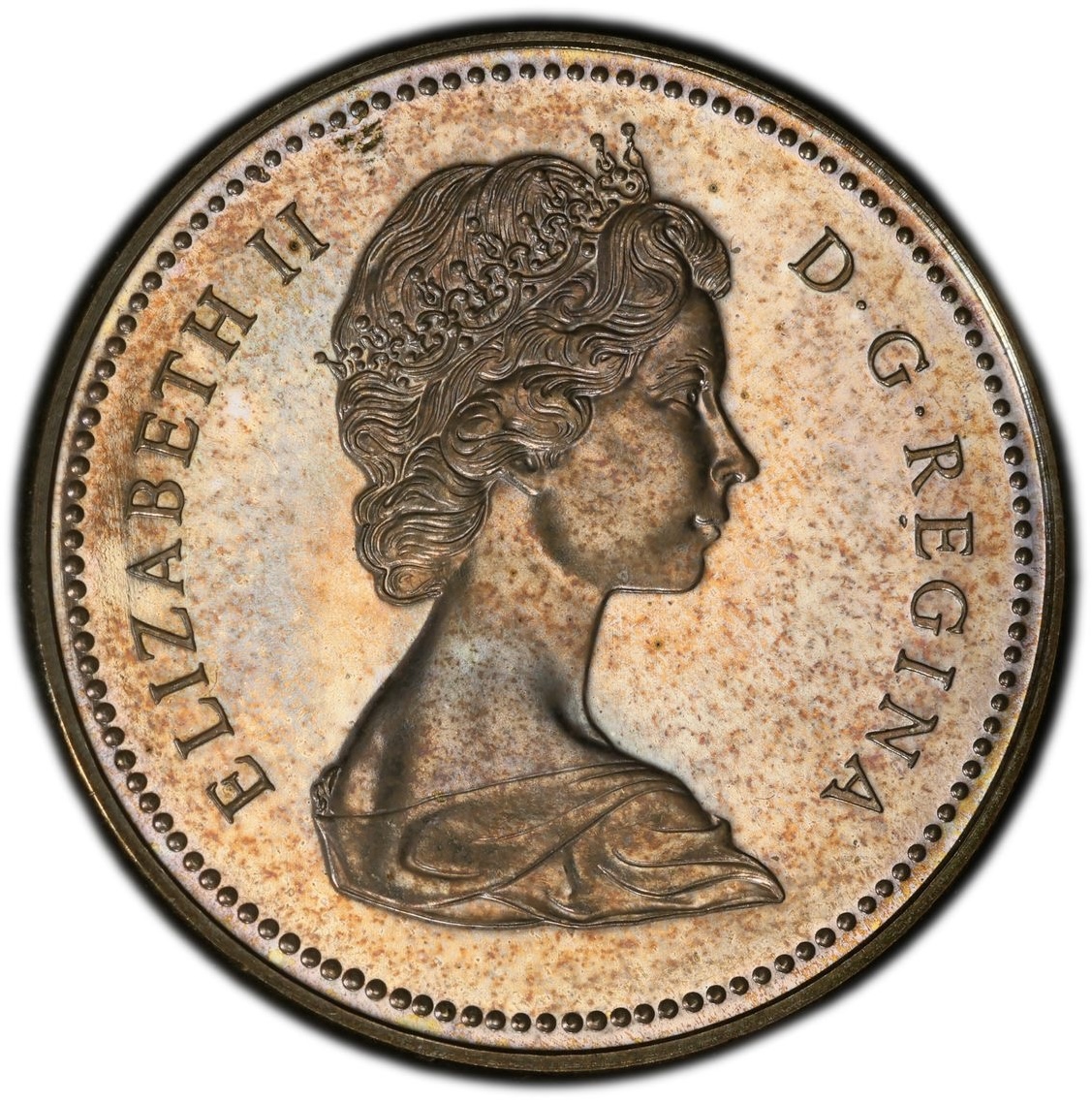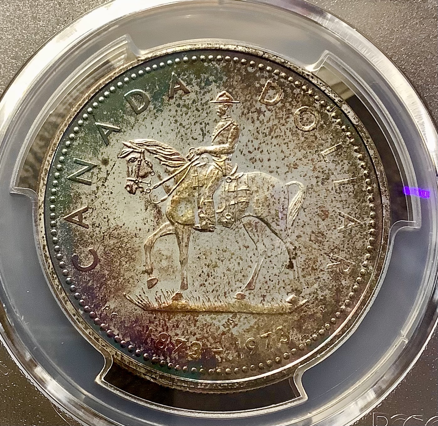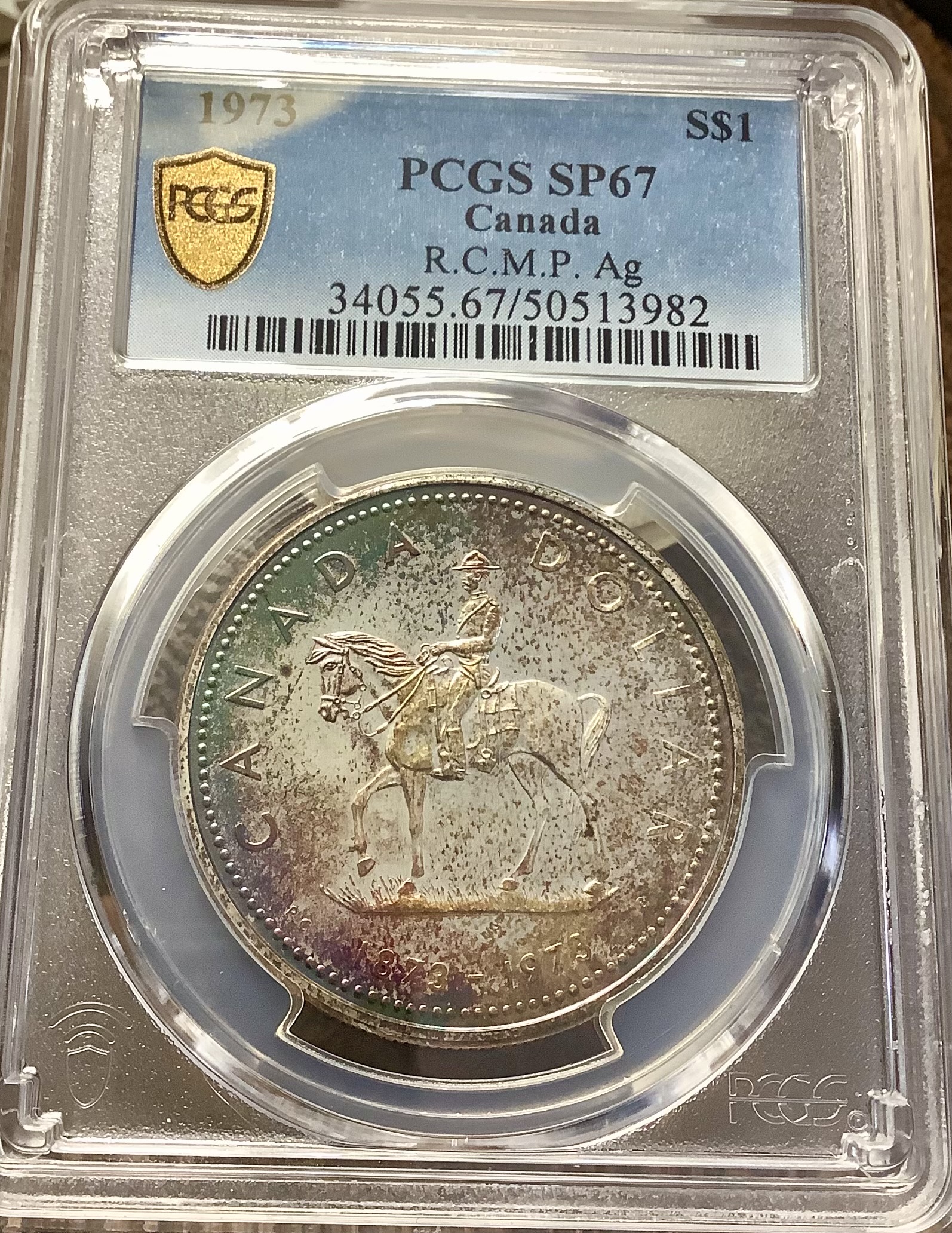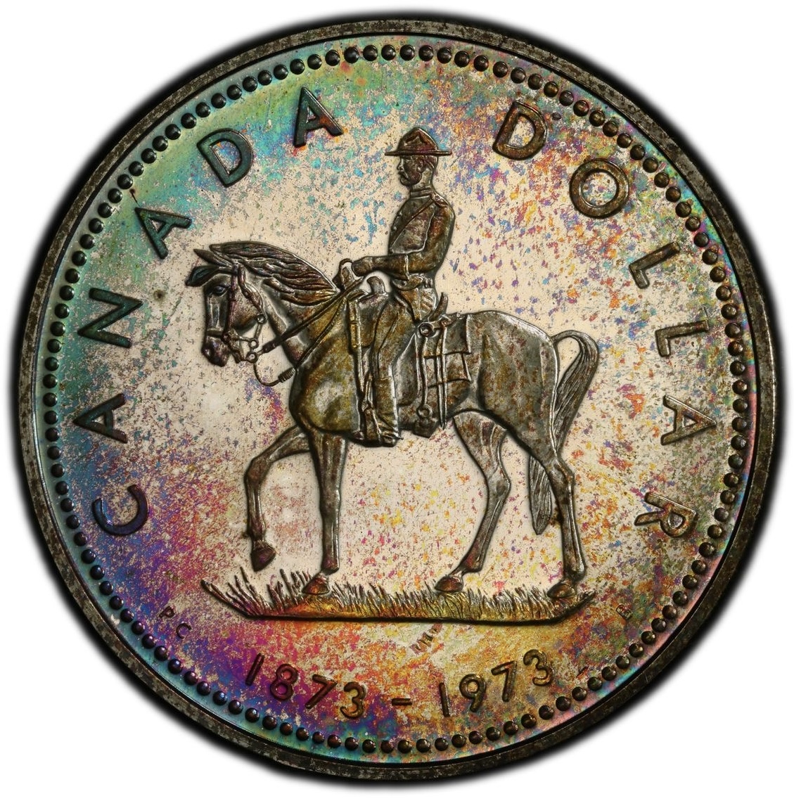 1973 Canada RCM .500 Fine Special Strike R.C.M. P., Royal Mounted Canadian Police Silver Dollar – Beautifully and Colorfully Toned in rainbow colors and hues of turquoise, gold, rose and sunset orange – graded PCGS SP67