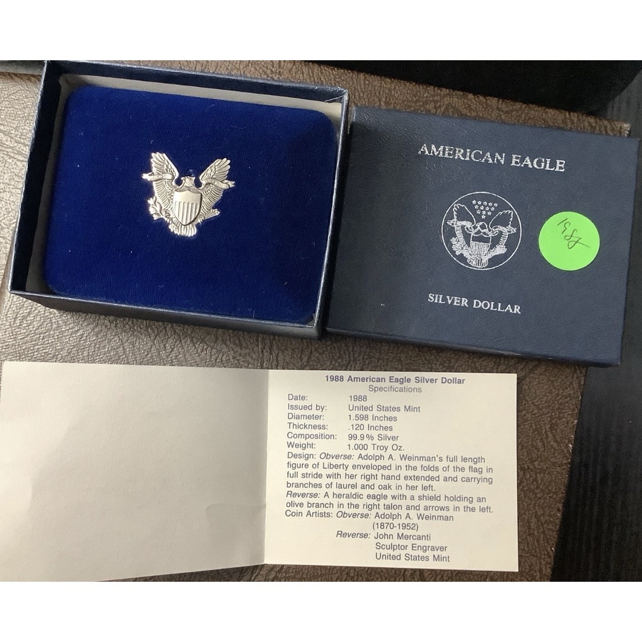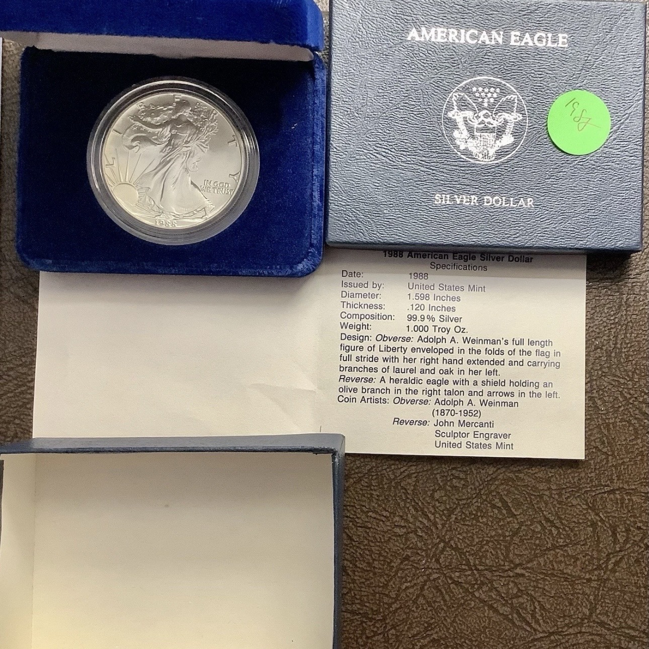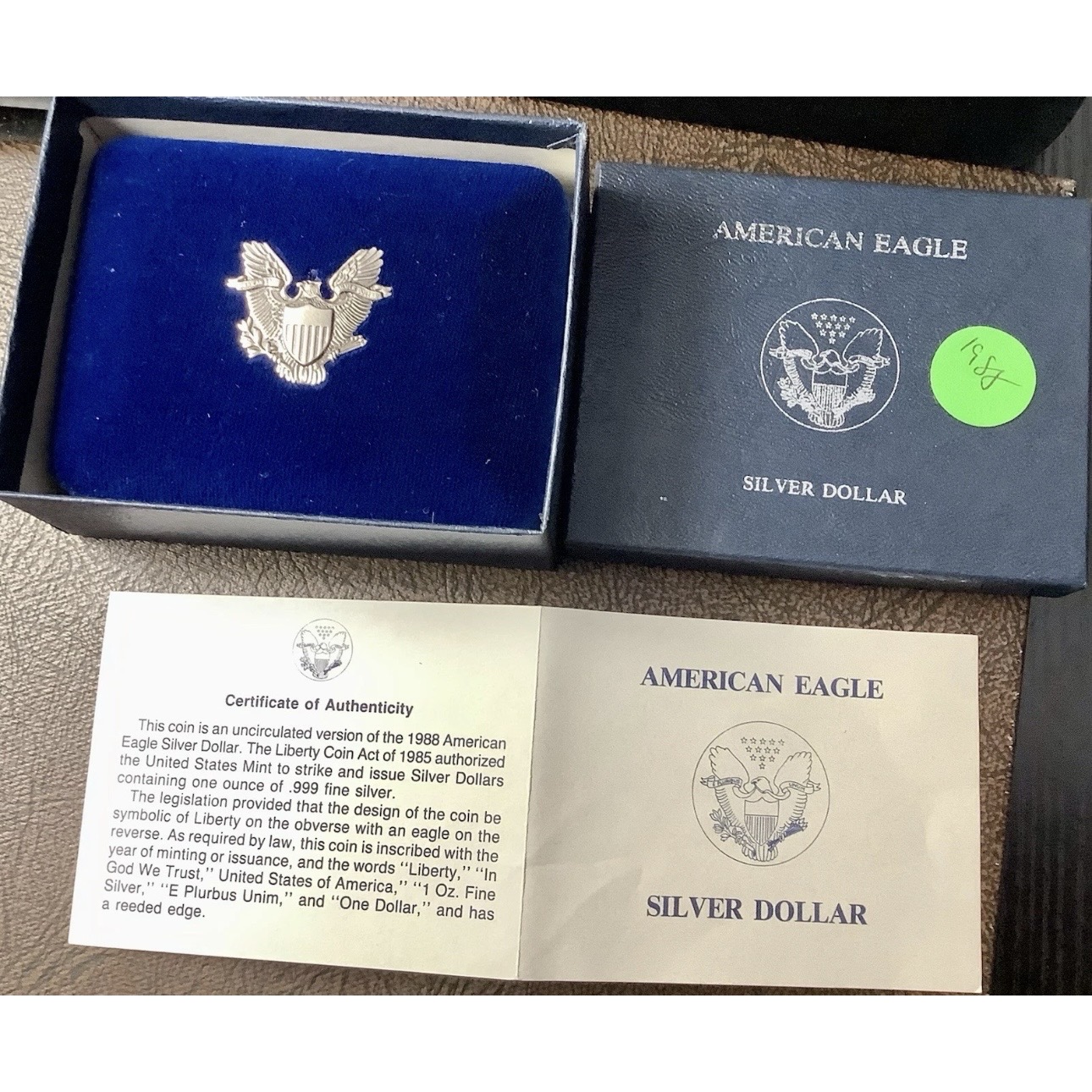 1988 1 oz .999 Fine Silver American Silver Eagle Uncirculated Burnished Issue in Original Government Packaging with COA (OGP).