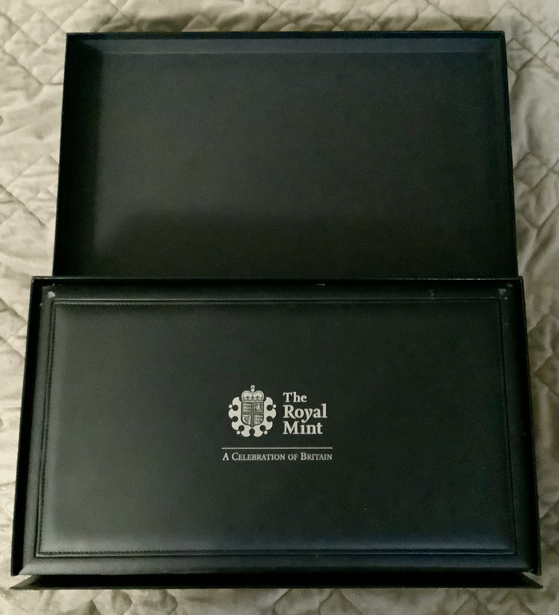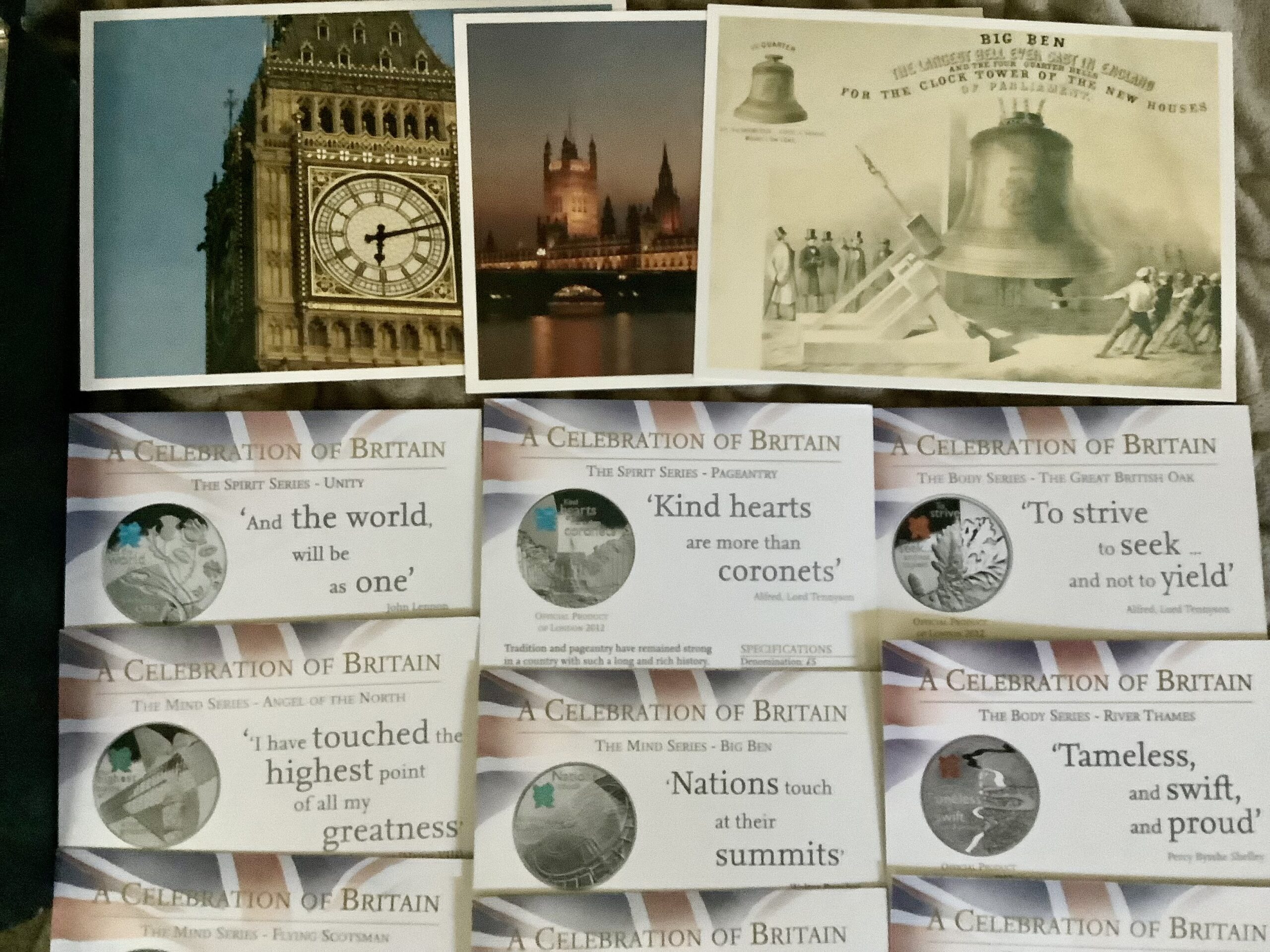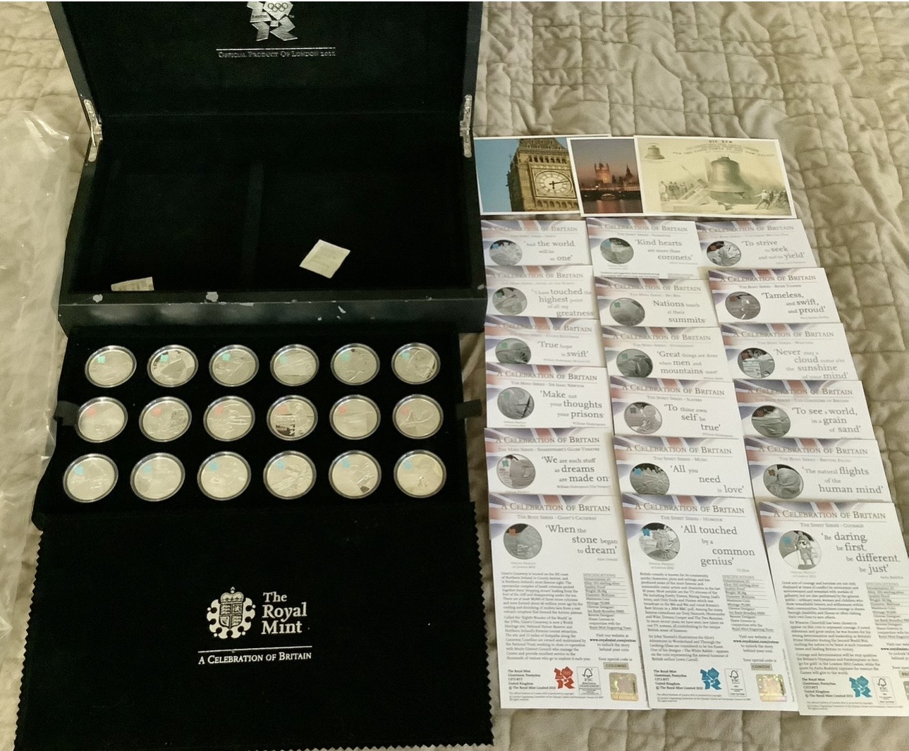 Comes with the Full Original Government Packaging, OGP, which includes the Hard Bound Leather Case, 18 Individual Cards describing each of the 18 coins and 3 Post Cards including one of Big Ben in London.