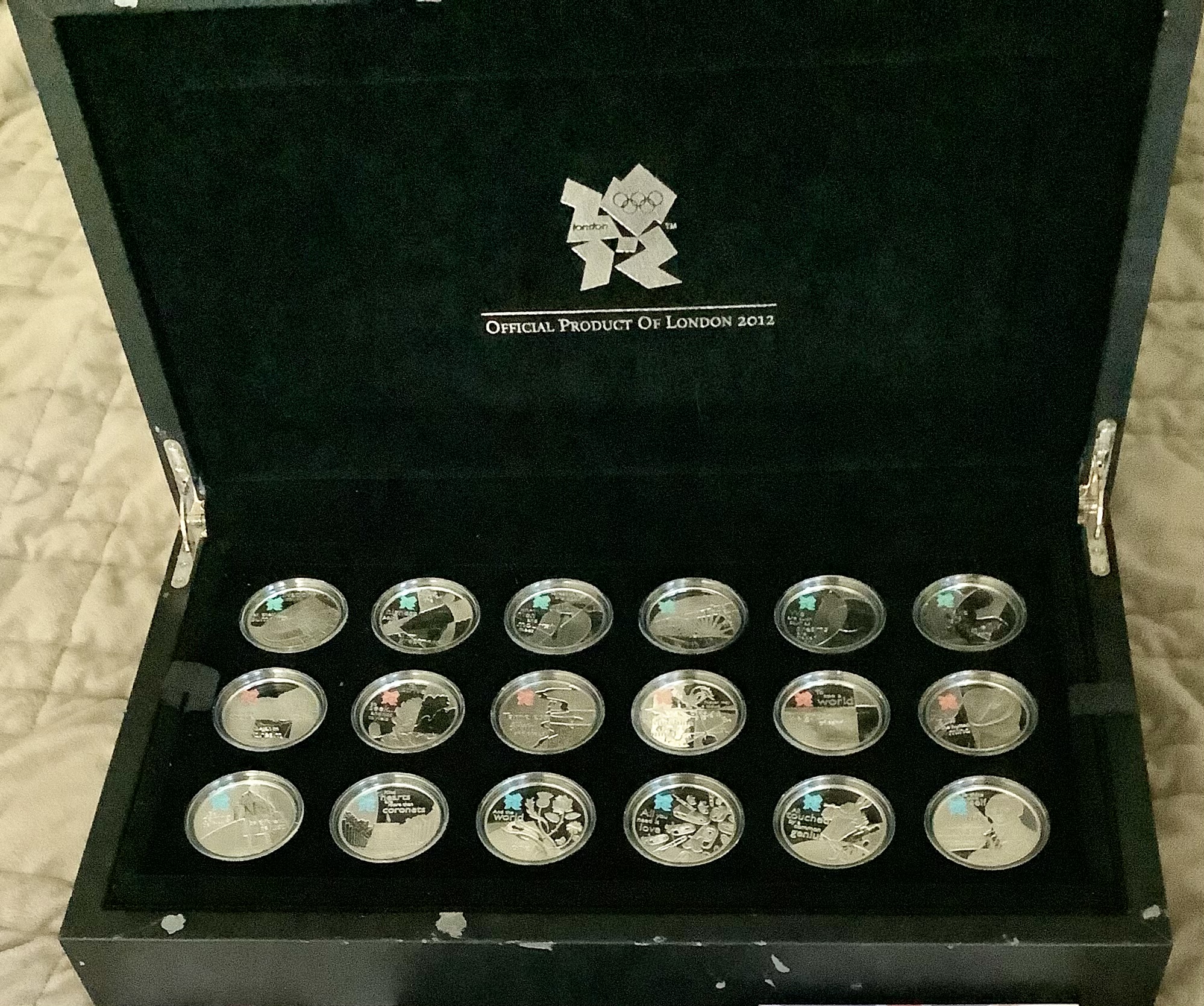 The set and all components are in excellent condition. Each coin comes inside a hard shell plastic capsule and all 18 are in superb gem proof uncirculated condition. The box, leather case and all COA’s are in excellent condition with very light wear. The only blemishes I can see are the closeup picture of some small paint chips faround and along the perimeter of the outer case. See the photos. Other than that, the rest of the set and all it’s components are pretty much mint.