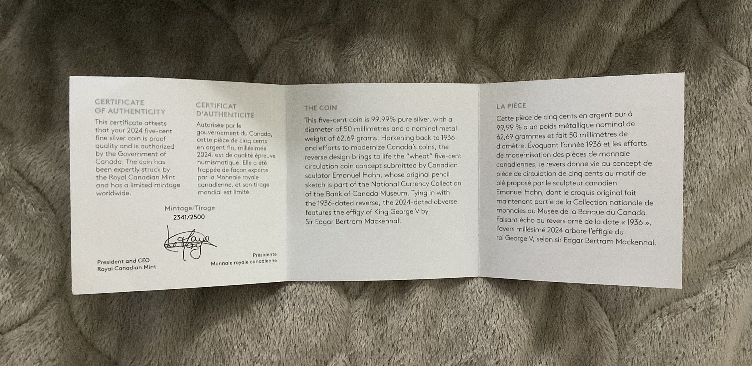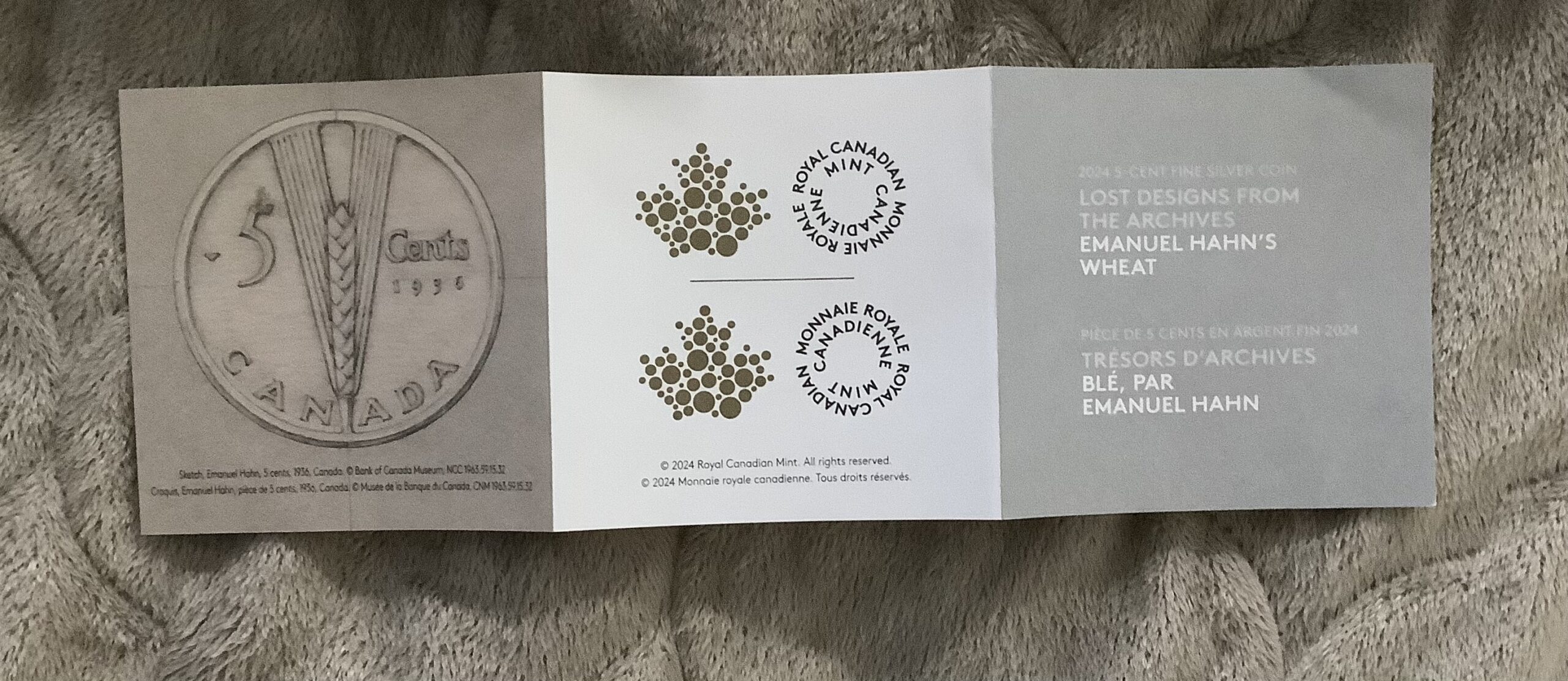 Canada’s Royal Canadian Mint – 2024 2 oz .9999 Silver 5 Cent Lost Designs from the Archives, Emanuel Hahn’s Wheat Masters Club Exclusive