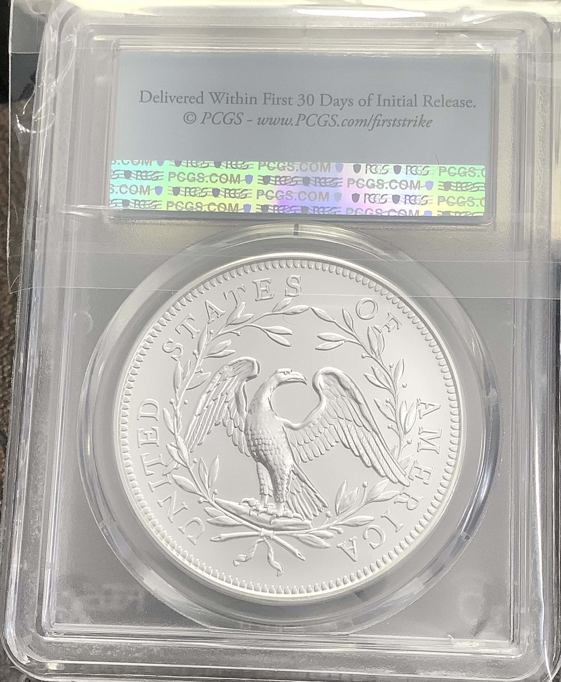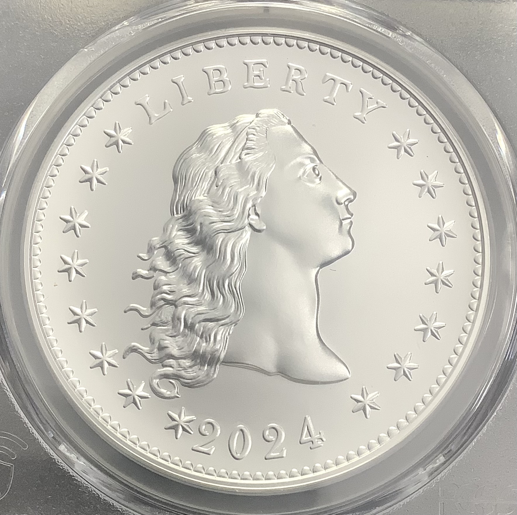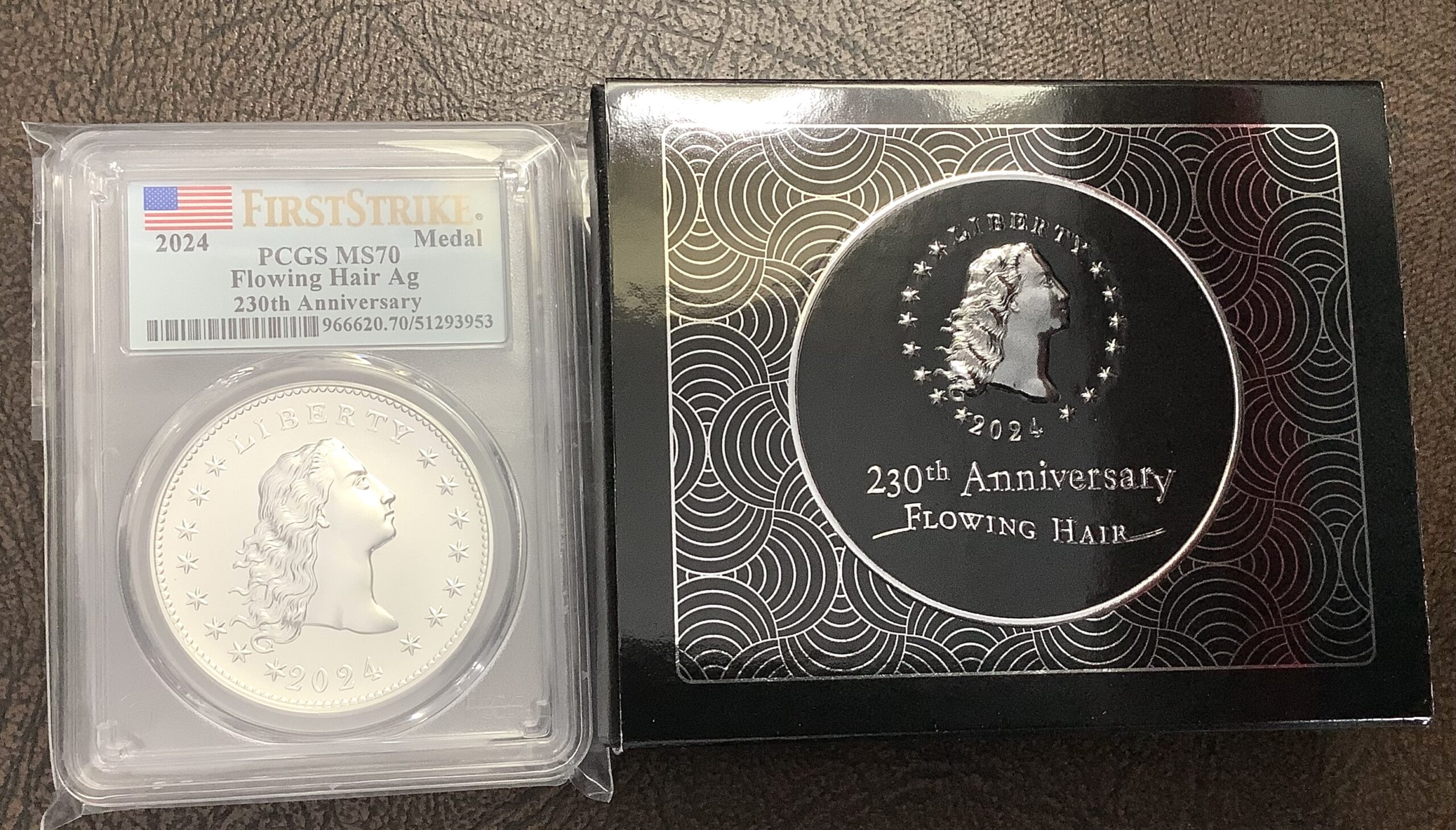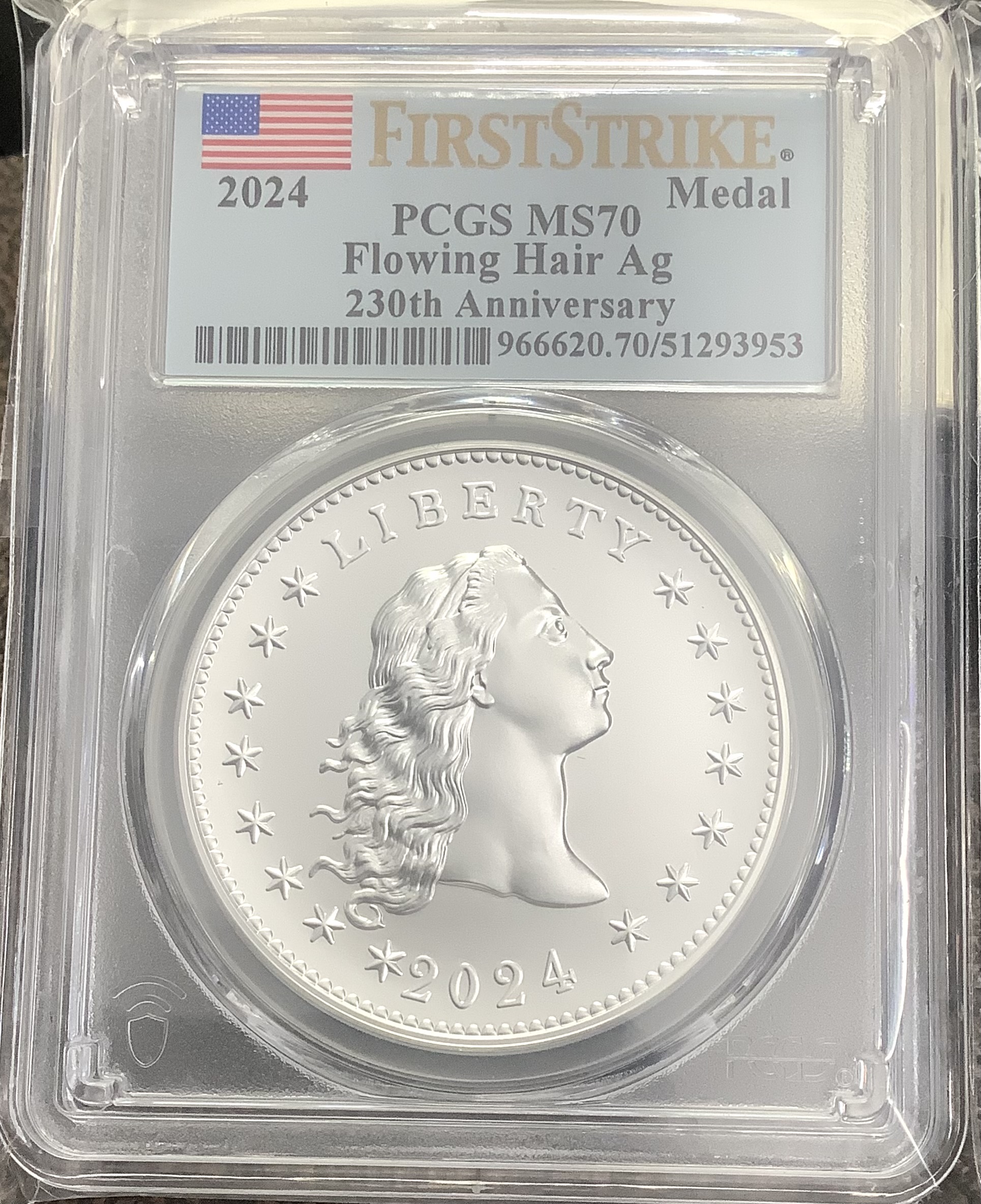 2024 Flowing Hair Medal graded PCGS MS70 First Strike. This coin is struck in 1oz of .999 silver and commemorates the 230th anniversary of the Flowing Hair design. It commemorates the first silver dollar ever minted by the United States and features the classic flowing hair design.