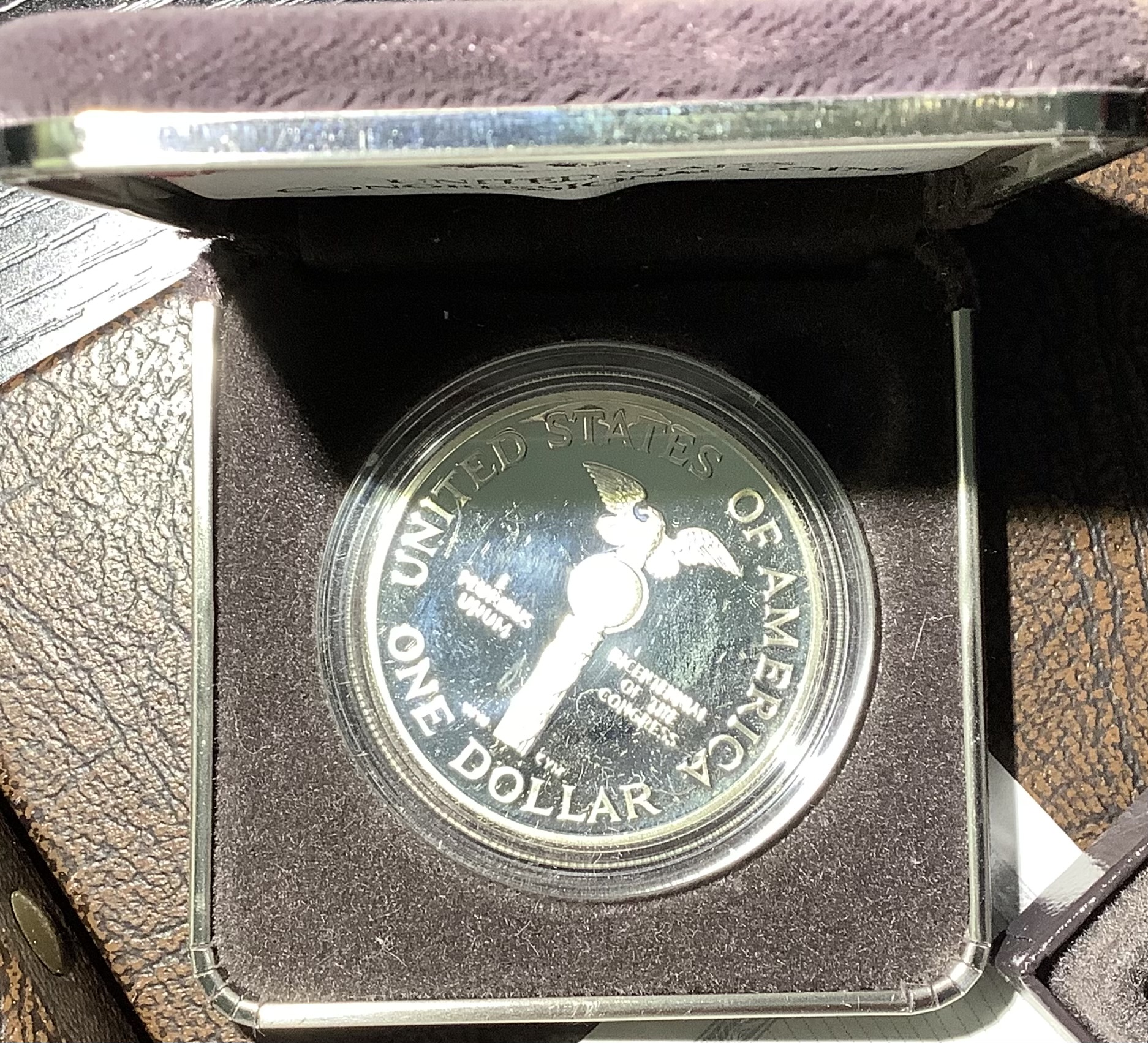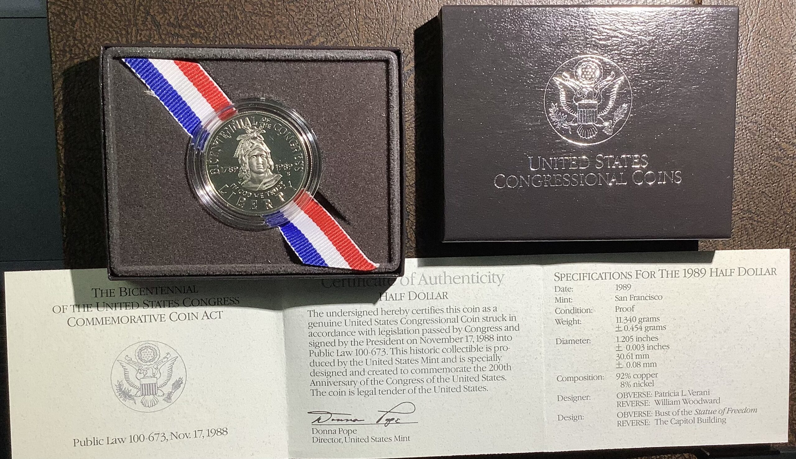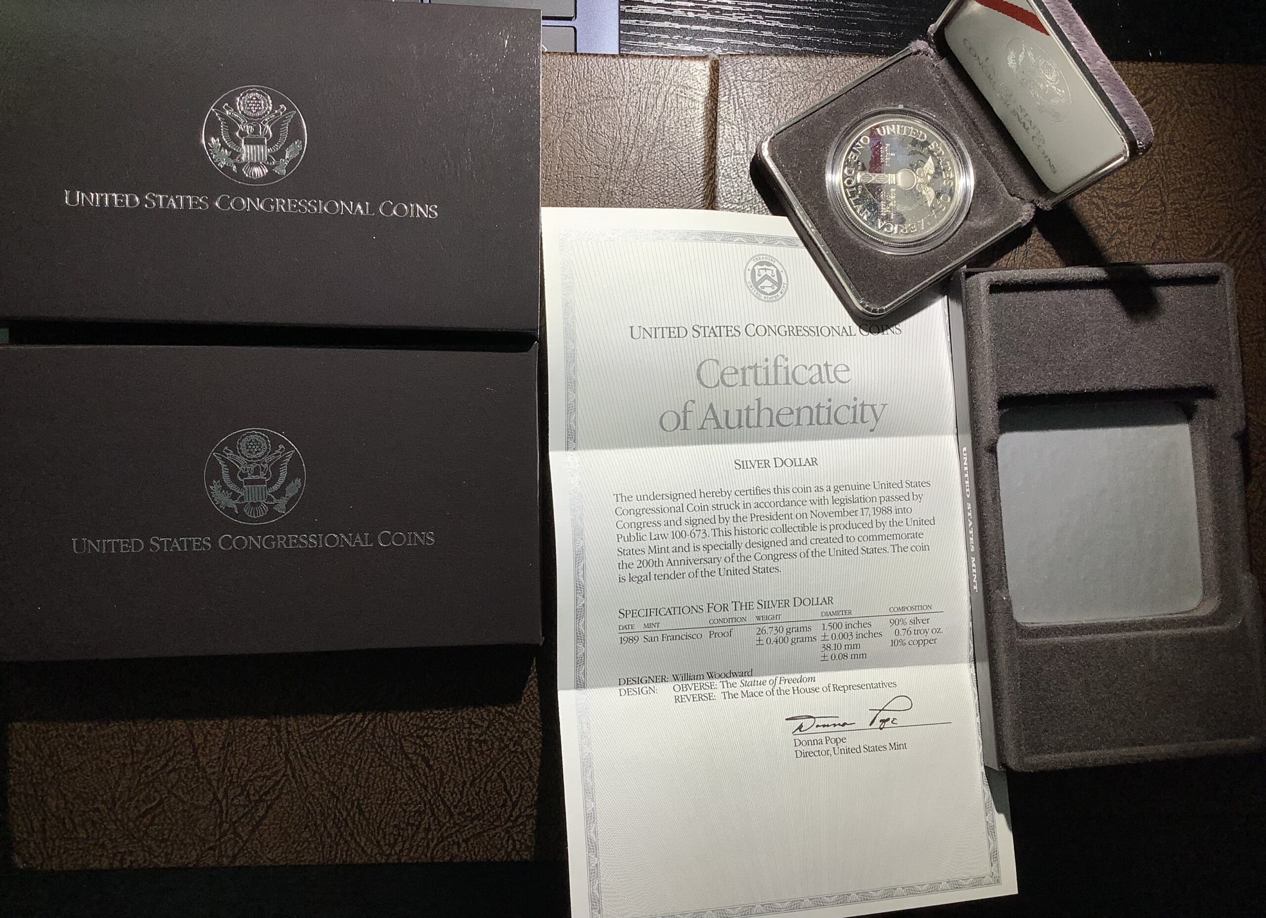 One (1) 1989-S Congressional Coins 90% Silver Dollar. Comes with Original Government Packaging – Brown Box, Outer sleeve and COA – 90% Silver/10% copper classic US Mint Silver Dollar composition (0.77 Troy oz silver)