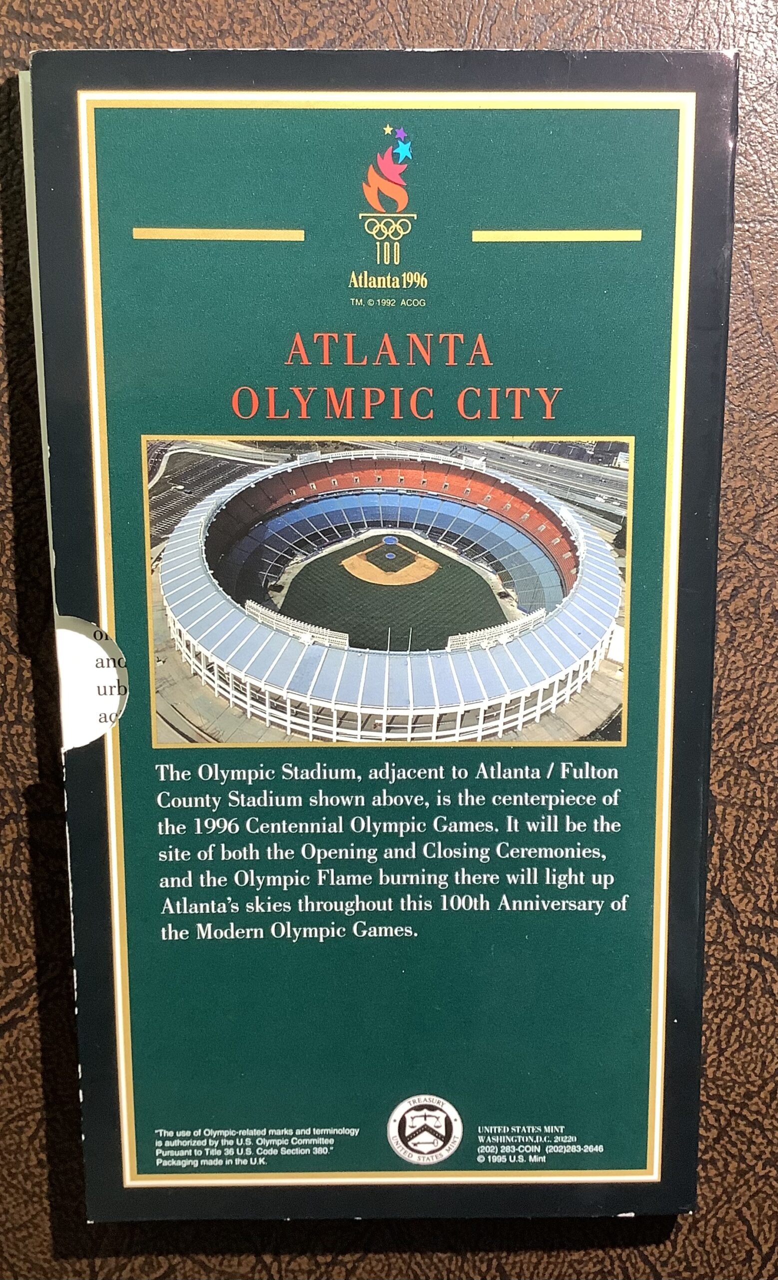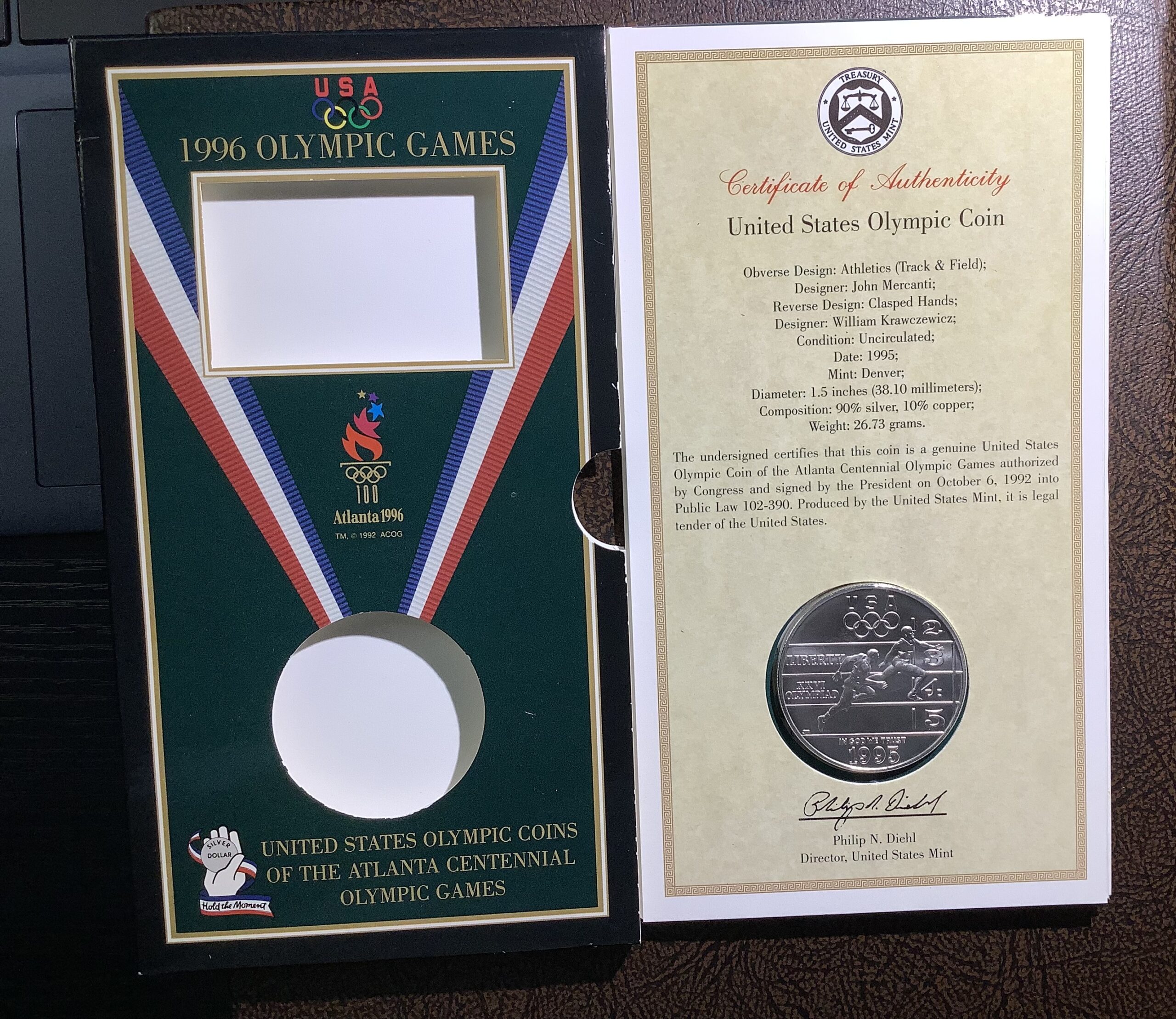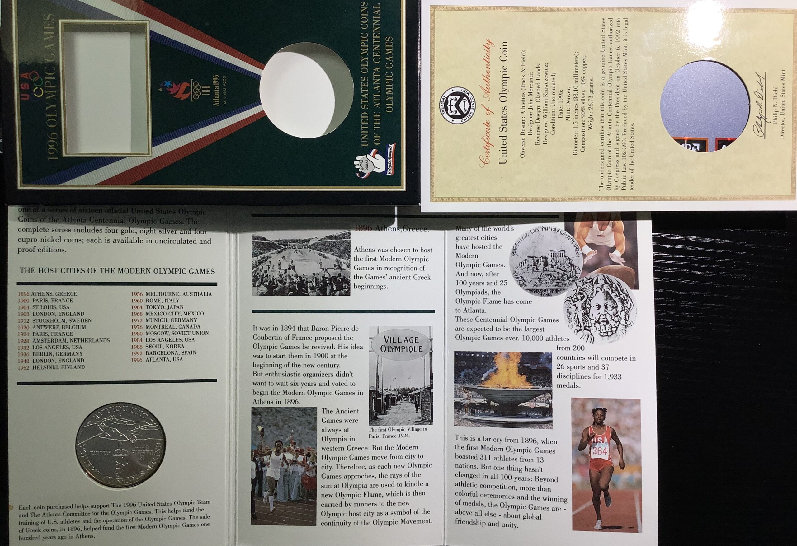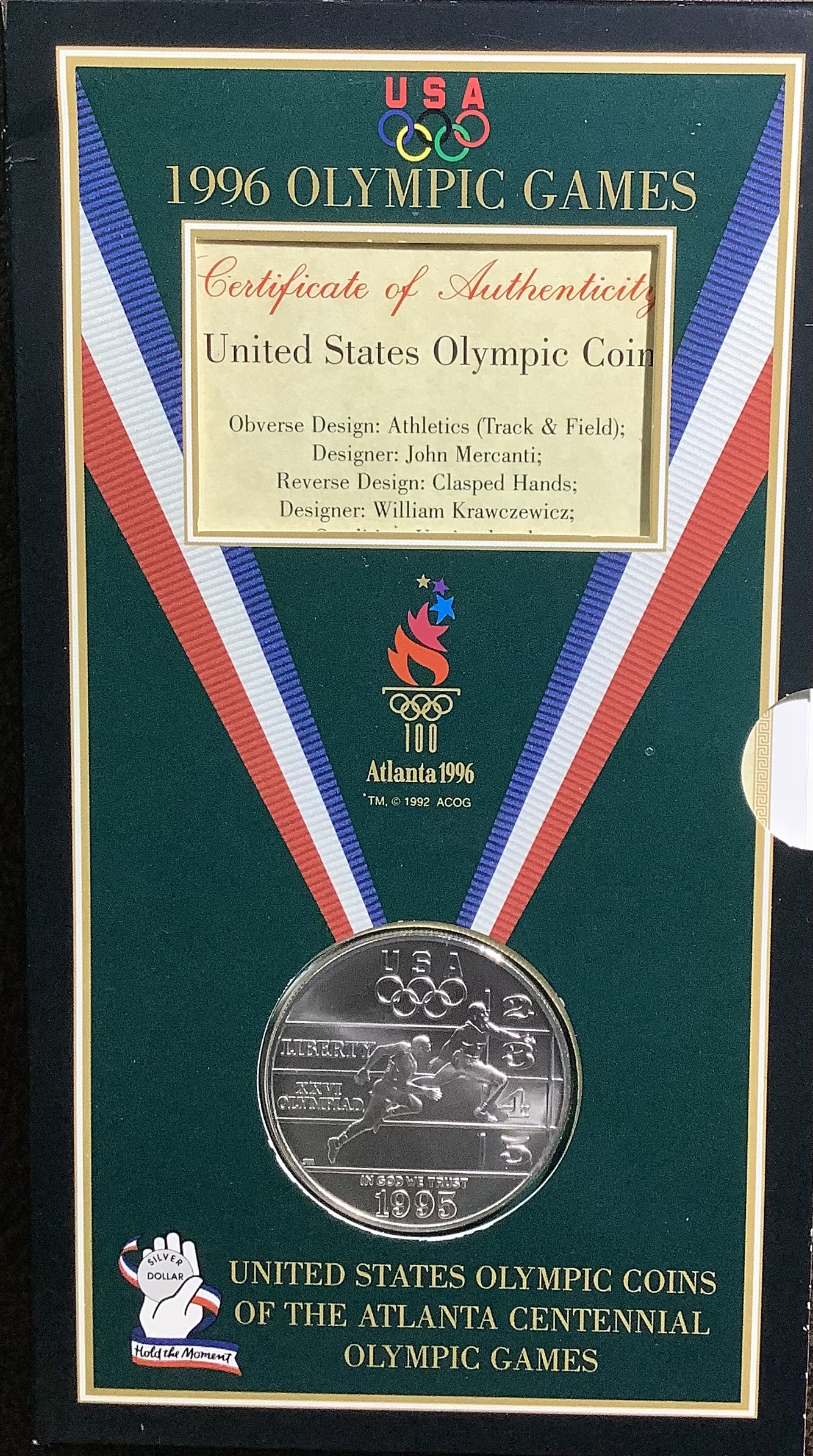 One (1) 1996 Proof United States Olympic Games 90% Silver Dollar. This one comes with the US Mint issues rectangular Special Box with COA and Olympics flyer (see pictures) – 90% Silver/10% copper classic US Mint Silver Dollar composition (0.77 Troy oz silver)