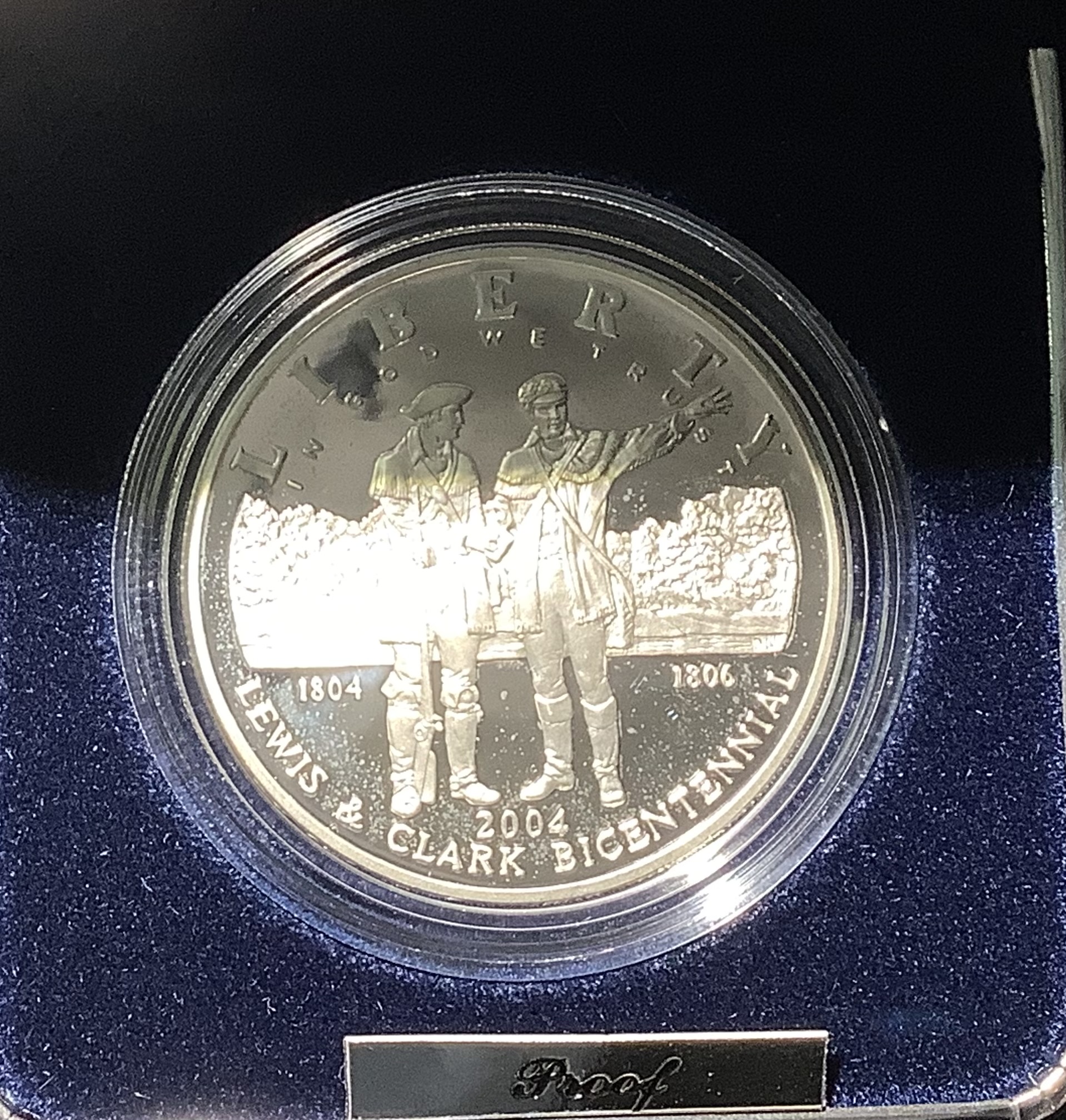 One (1) 2004-S Proof Lewis and Clark 90% Silver Dollar. Comes with Original Government Packaging – Blue Box, Outer sleeve and COA – 90% Silver/10% copper classic US Mint Silver Dollar composition (0.77 Troy oz silver)