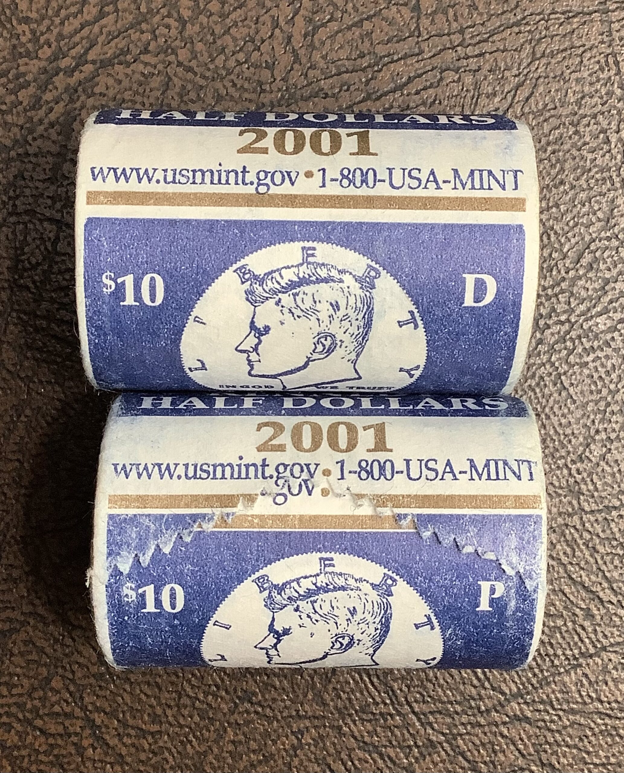 Lot of Two (2) US Mint Wrapped (Bank Wrapped) Rolls of 2001 P, and D Kennedy Half Dollars – 20 coins per roll or $10 Face Value per roll, $20 Face Value total.
