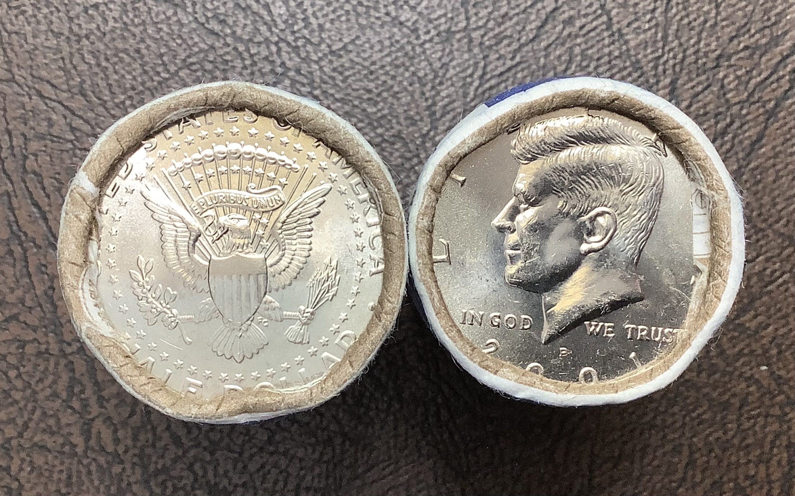 OBW US Mint Bank Wrapped Original BU Rolls 2001 P, D Kennedy Half Dollars