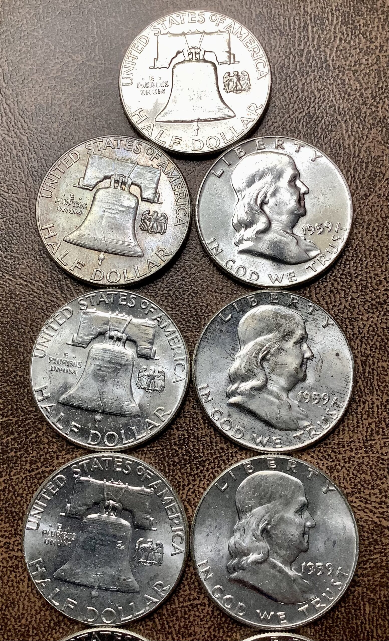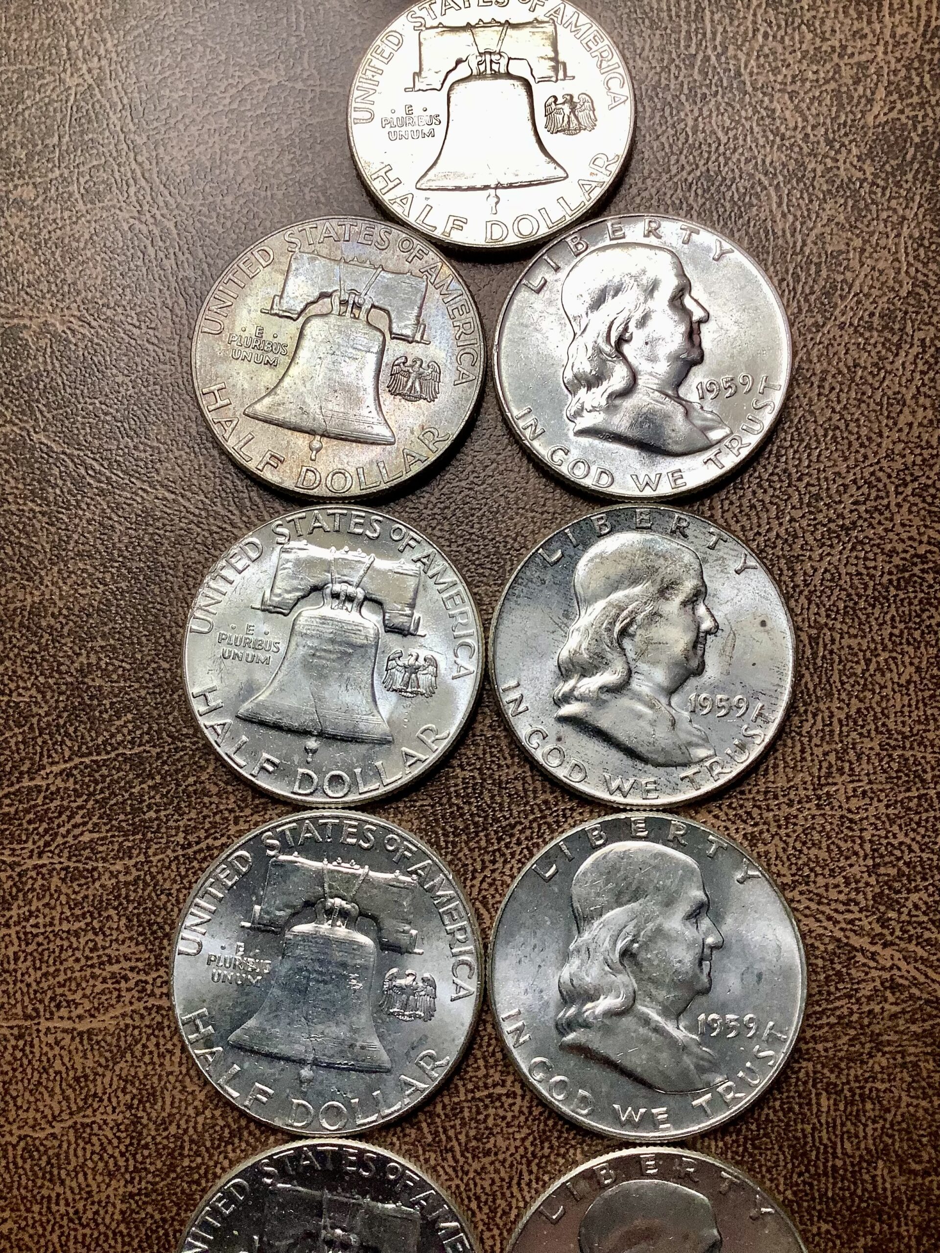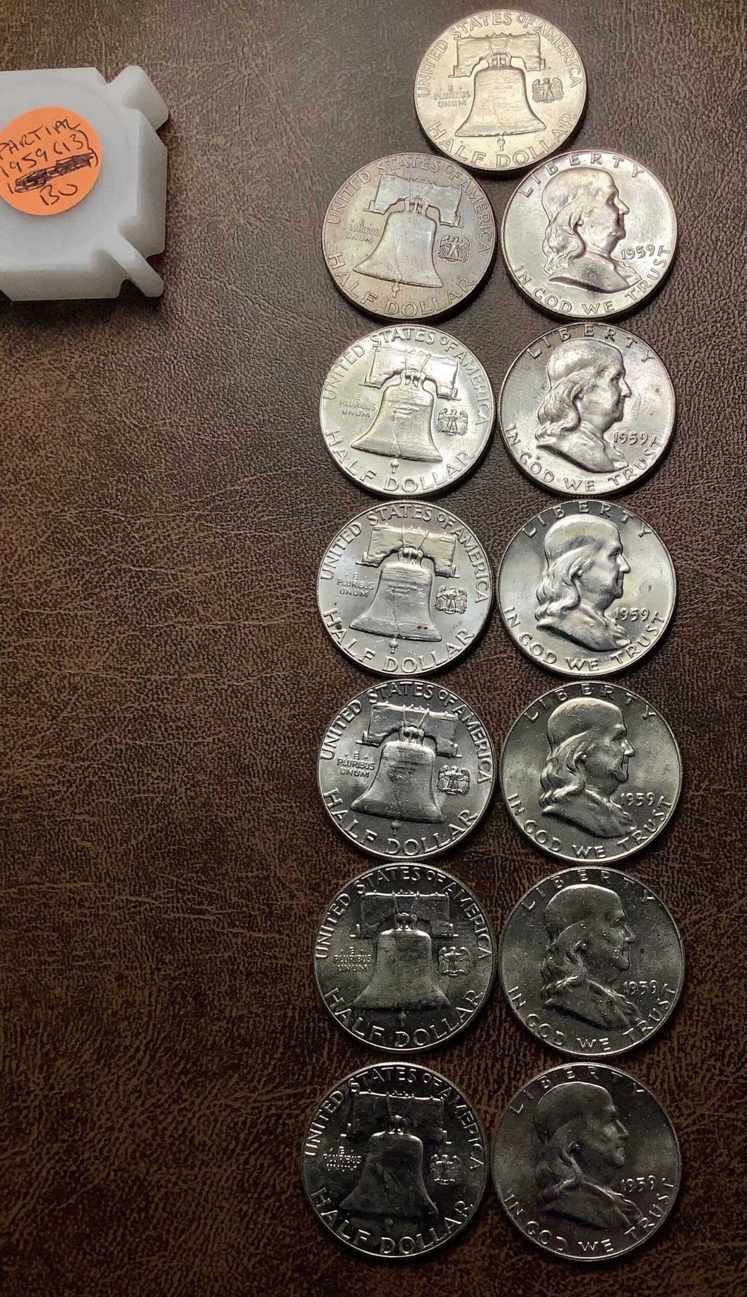 Partial Roll (13) 90% Silver 1959 Franklin Half Dollars Choice BU w/Toned End
